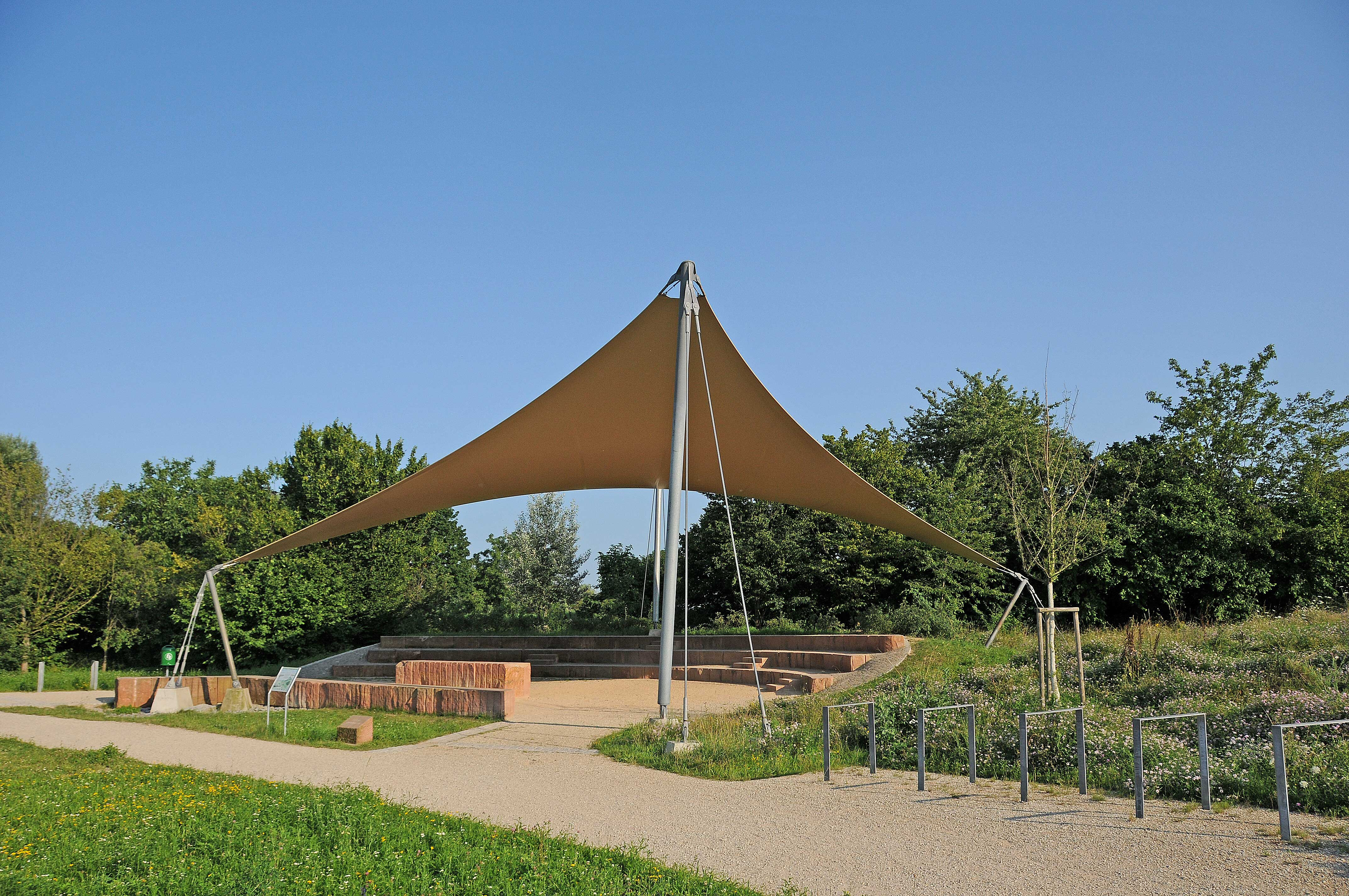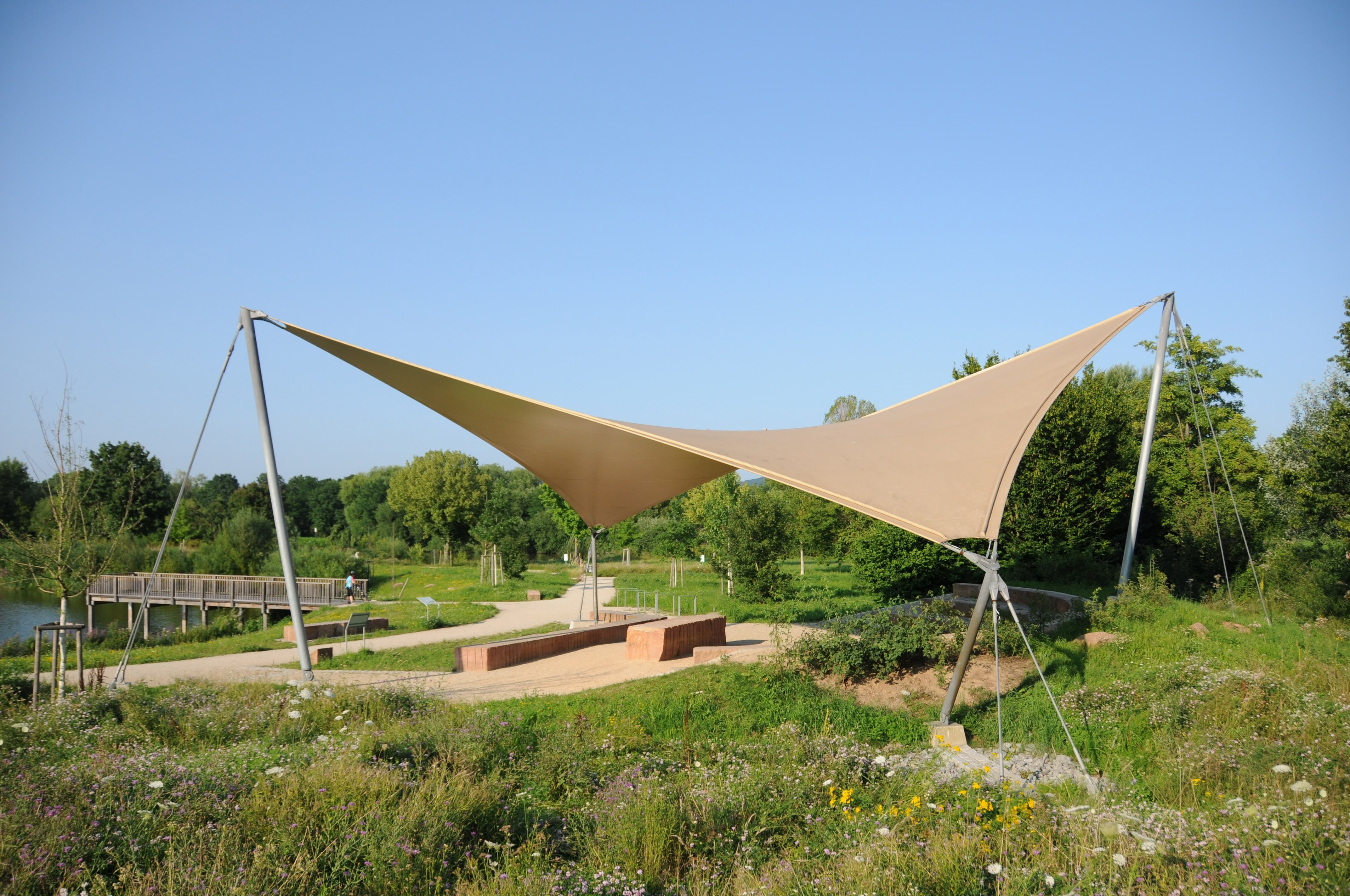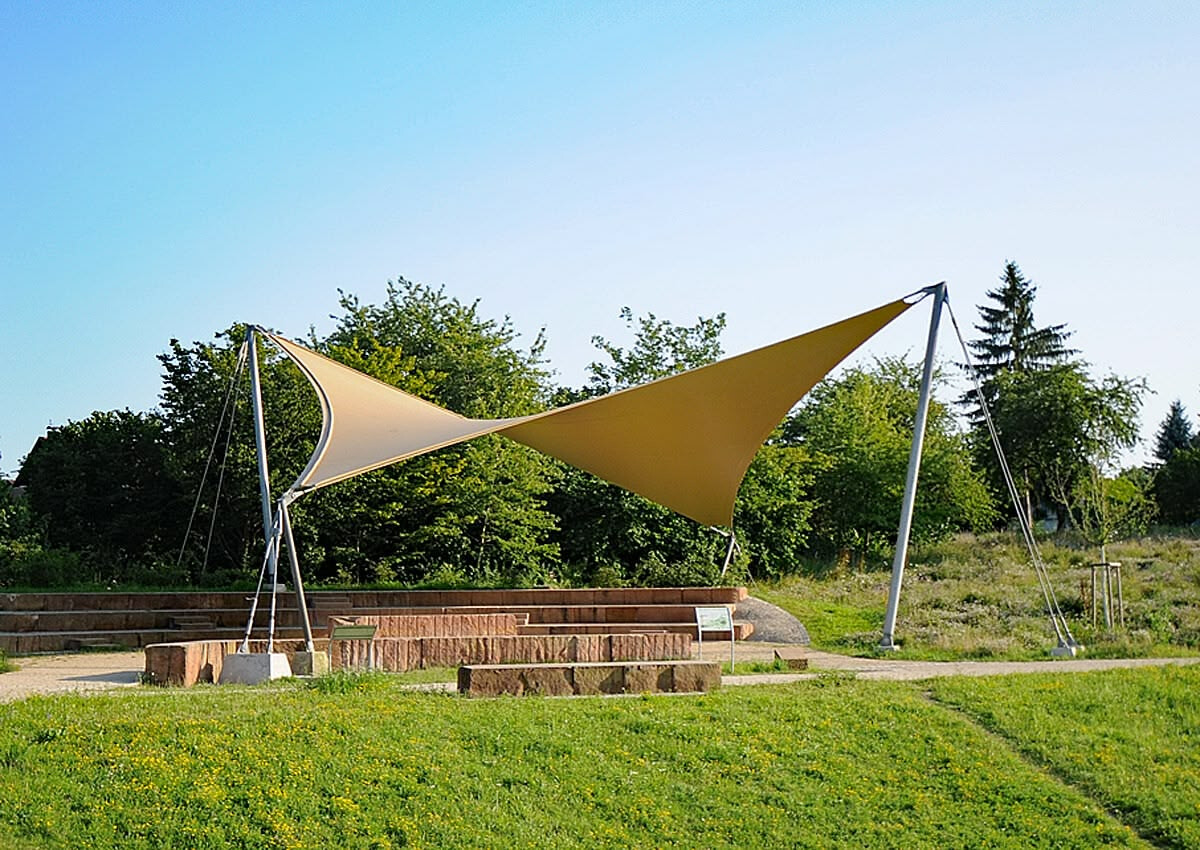 Bei der Anfertigung des 4-Punkt-Segels wurde ein besonderer Augenmerk auf optisch reduzierte Details gelegt. Auch farblich fügt sich das Segel optimal in das umliegende Landschaftsbild ein und korreliert sehr gut mit den Steinen des Rondells. Das Sonnensegel bietet letztlich nicht nur einen optisch ansprechenden Sonnenschutz, es zeichnet sich auch durch eine rasche Montage, minimalen Wartungsaufwand und hohe Lebensdauer auf.