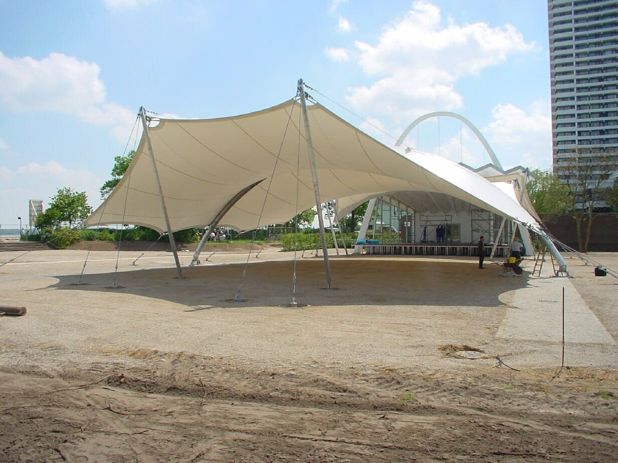 In Lübeck-Travemünde wurde das Bühnendach des Musikpavillons Brückmanngarten erweitert. Darüber hinaus wurden auch sämtliche Zuschauerplätze überdacht. Bei dieser Lösung wurden verschiedene Konstruktionsprinzipien miteinander vereint, wie zum Beispiel die Abspannung der Membrane direkt zum Bodenfundament sowie über Stützen zum Boden und ein großer Membranbereich, der ganz zuverlässig von einem Bogenbinder unterstützt wird.