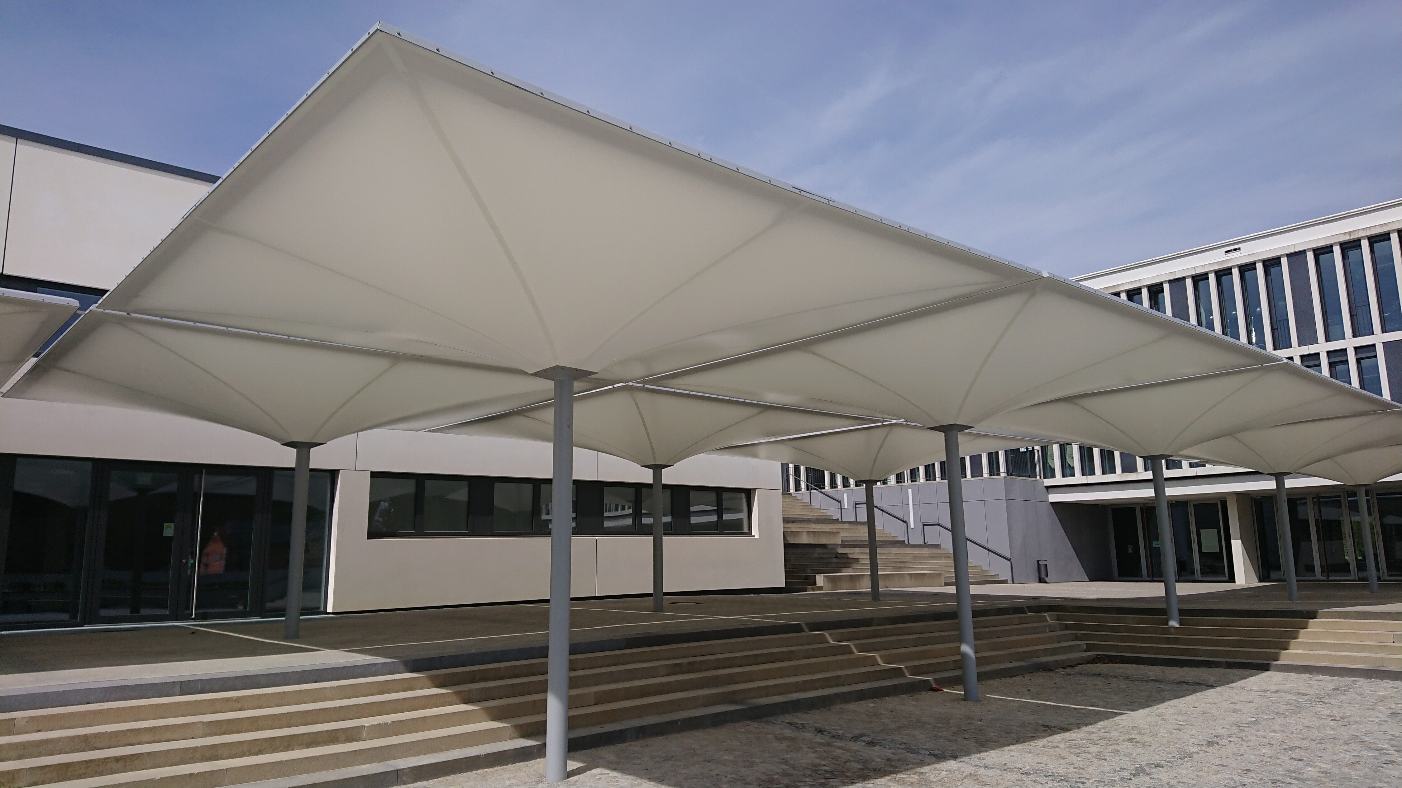 Die Bespannung der Schirme besteht aus einer doppellagigen Membranbespannung (Oberlage und Unterlage), welche durch die Zuschnittsgeometrie eine leicht gewölbte konkave Formgebung aufweisen. Den Anforderungen des baulichen Brandschutzes wurde durch die Verwendung eines „schwer entflammbaren“ (Brandschutzklasse B1) Polyestergewebes mit beidseitiger PVC-Beschichtung entsprochen. Die hochwertige PVDF-Oberflächenversiegelung schützt das Gewebe zusätzlich vor Umwelteinflüssen.