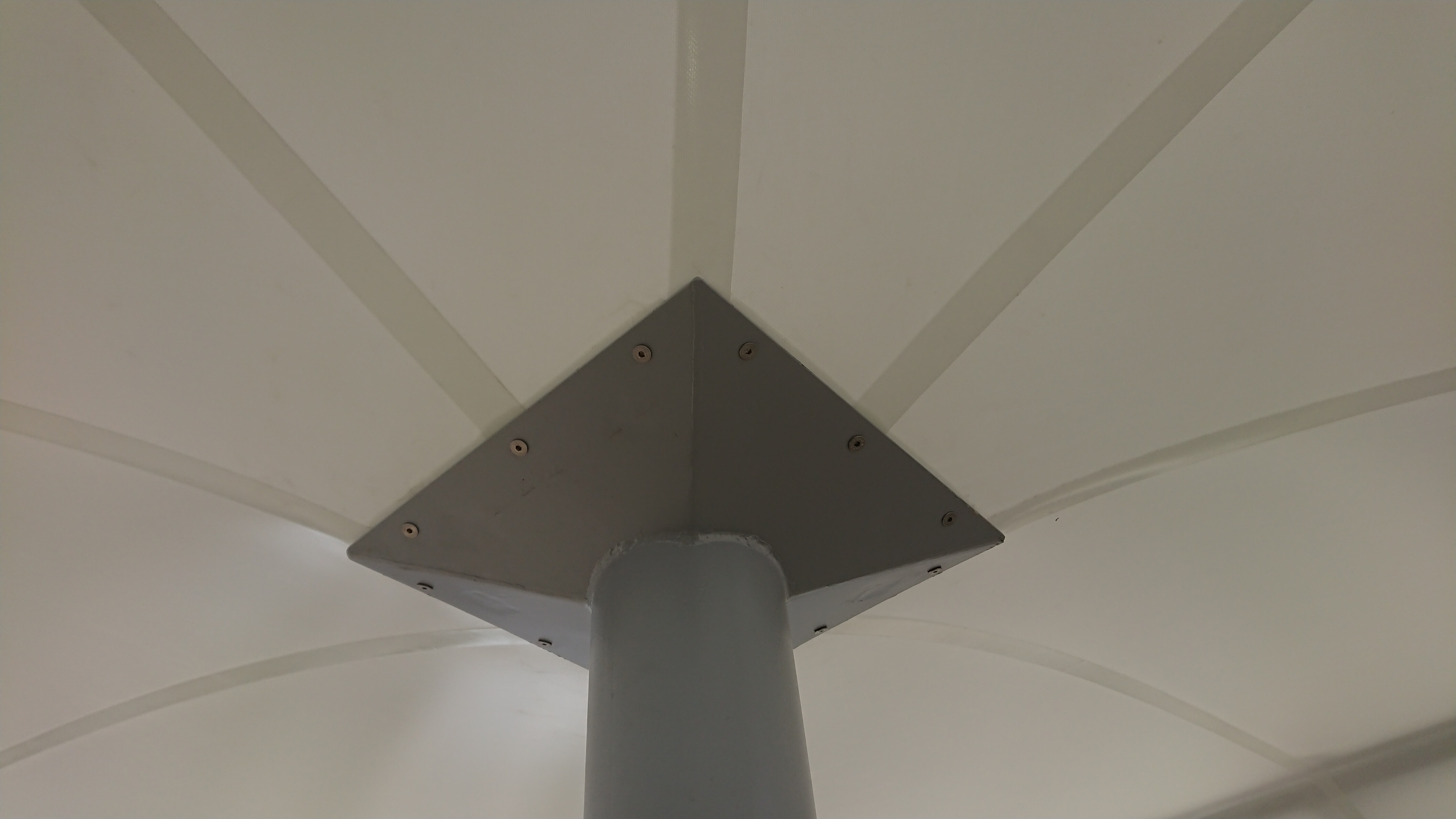 Die Überdachung besteht aus insgesamt 13 quadratischen Schirmen und kommt auf eine Gesamtfläche von ca. 510 m². Jeder Schirm hat Abmessungen von 6 x 6 Metern. Die Entwässerung erfolgt jeweils über die zentralen Masten, wobei die Schirme direkt an die Regenwasserkanalisation angeschlossen sind.