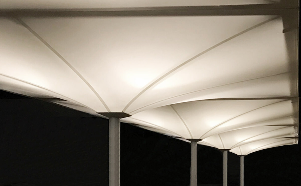 Koch Membranen war neben der Planung und kompletten Bauausführung auch für die integrierte Beleuchtungstechnik der Schirme verantwortlich und konnte somit eine Komplettlösung für den Bauherrn realisieren. Bei der eingesetzten Membrane wurde besonders darauf geachtet, dass diese eine sehr hohe Lichttransluzenz aufweist. Somit verwandeln die in den Schirmen eingebauten, dimmbaren LED-Scheinwerfer die Schirme in homogen strahlende "Lichtobjekte".