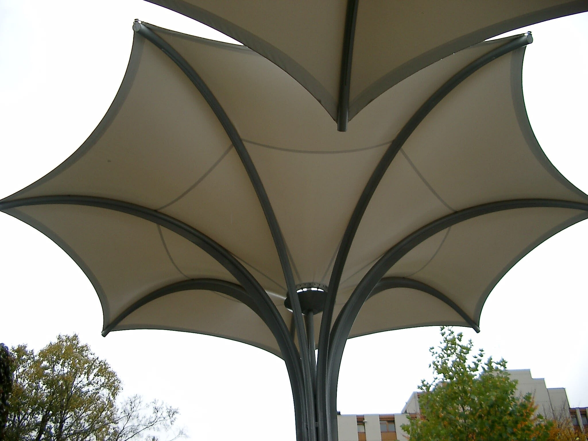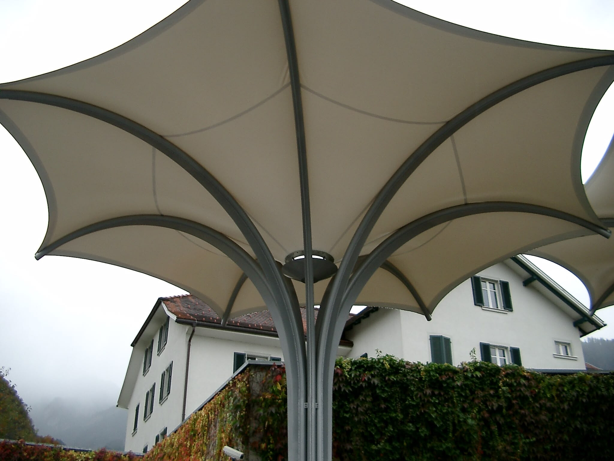 Die Zufahrtsüberdachung der Parkplatzeinfahrt für das Krankenhaus Hohenems in Österreich wurde mit zwei Trichterschirmen mit je einem Durchmesser von 7,20 m realisiert.