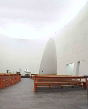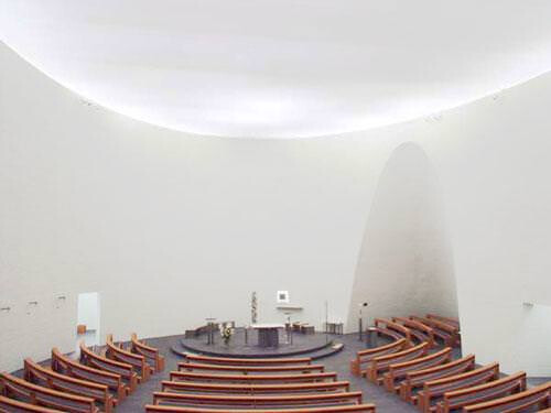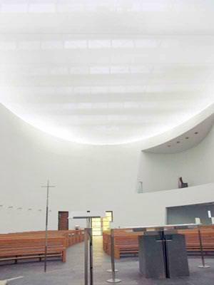 Moderne Sakralarchitektur: Ein ovaler Kirchenraum erhält durch transluzente Membrantechnik eine spirituelle Lichtatmosphäre.