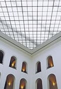 Im Finanzgericht Köln wurde der Innenhof mit einer abgehängten Decke ausgestattet. Das hochtransluzente Gewebe lässt die bisherige Konstruktion erahnen, schafft aber ein beinahe vollständiges Streulicht. Das Helioflon Licht- und Akustikgewebe schafft durch die hohen Schallabsorptionswerte eine angenehme Raumakustik.