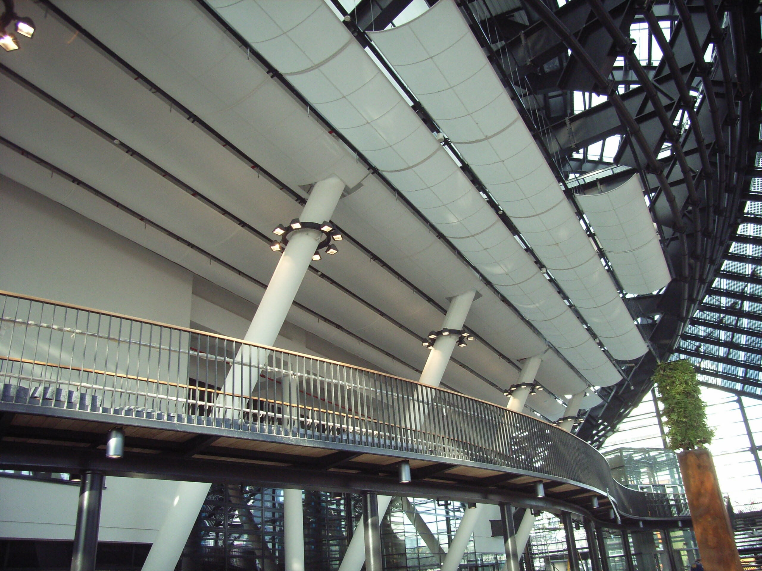 Der Baden-Württembergische Landtag hat während der Sanierung seines Landtagsgebäudes ein Übergangsquartier im Kunstgebäude Stuttgart in der Innenstadt bezogen. Als raumakustische Maßnahme schwebt über dem Plenum – wie ein riesiger Lampenschirm – ein weißes, trichterförmiges Gebilde. Die über fünf Meter hohe und zweilagig mit Akustikgewebe bespannte Aluminium- Konstruktion hat einen Durchmesser von ca. zehn Metern.