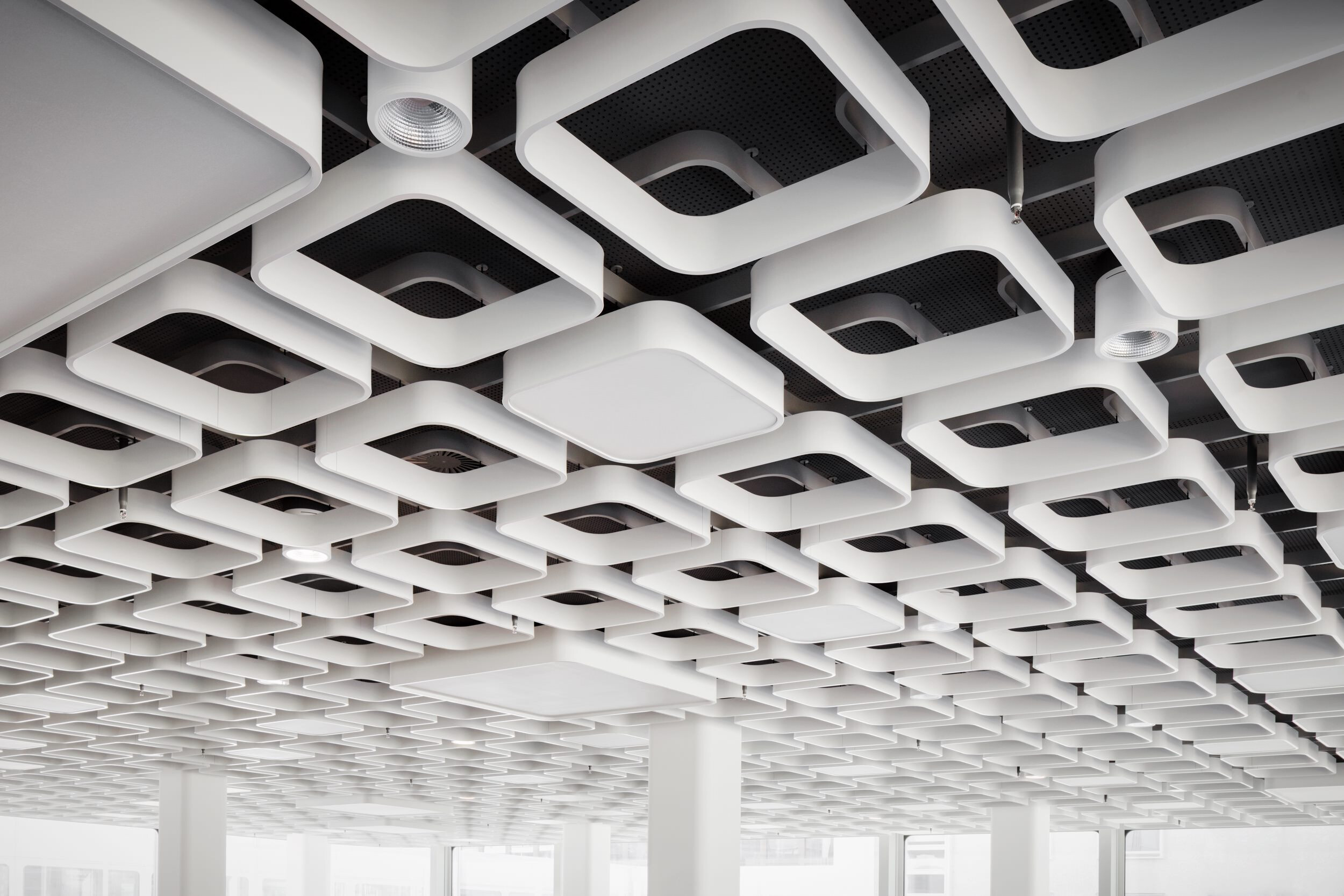 Die Lichttechnik der Leuchten befindet sich hinter einem lichtstreuenden Gewebe. Dieses wirkt dabei ohne weitere Maßnahmen schallabsorbierend und trägt maßgeblich dazu bei, die Nachhallzeiten in den Räumlichkeiten auf ein Minimum zu halten. Die Bespannung der Leuchten besteht aus einer hochtransluzenten Membrane und wurde mittels ausgesprochen filigranen und verdeckten Befestigungsdetails an den abgerundeten Deckenelementen befestigt.