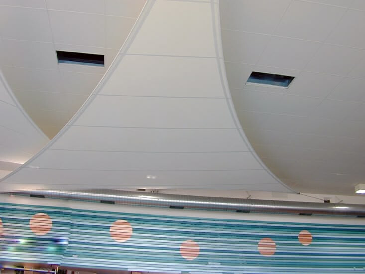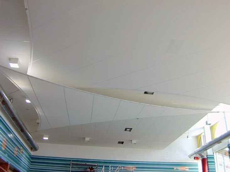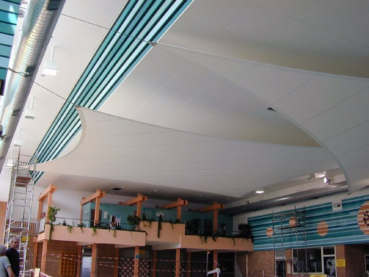 Wirtschaftlich und wirkungsvoll: Frei gespannte Deckensegel bieten flexible Akustiklösungen für große Schwimmhallen.