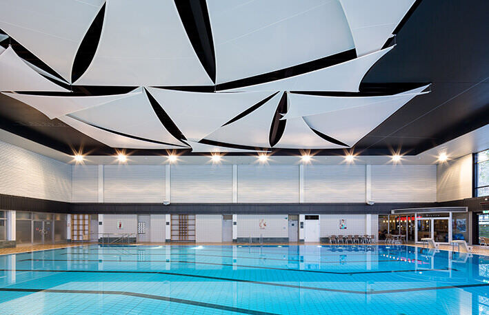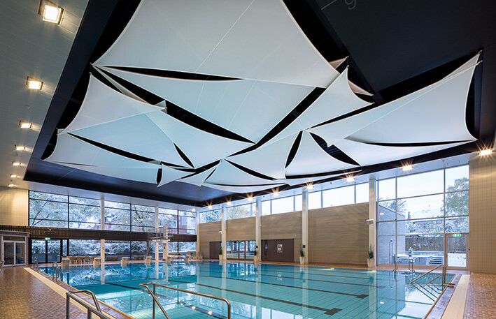Koch Membranen hat neben den Wandflächen an den Pools auch verschiedene Deckenflächen gestaltet. Das mit großformatigen Holzmotiven bedruckten Decken und die hinterleuchteten Wandbilder aus dem schallabsorbierenden Artex® Licht- und Akustikgewebe wirken täuschend echt und laden zum Verweilen ein.