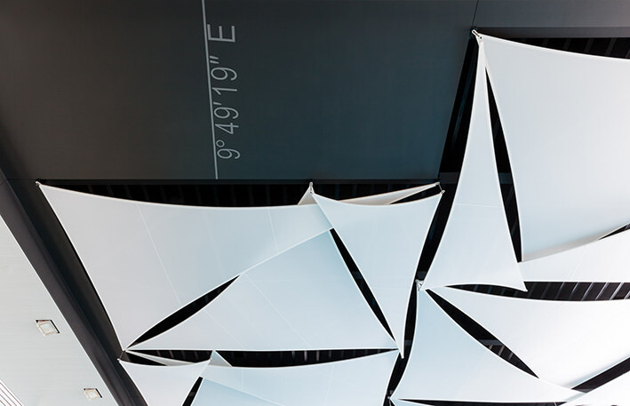 Die akustisch wirksame und somit schallabsorbierende Membrandecke besteht aus 18 dreieckigen Licht- und Akustiksegeln, die wiederum in drei verschiedenen Geometrien und gebogenen Rändern konzipiert wurden. Durch die Einfassung der Deckenflächen in einen dunklen Rahmen, werden die weißen Segel besonders gut in Szene gesetzt und verbreiten eine ausgesprochen maritime Stimmung.