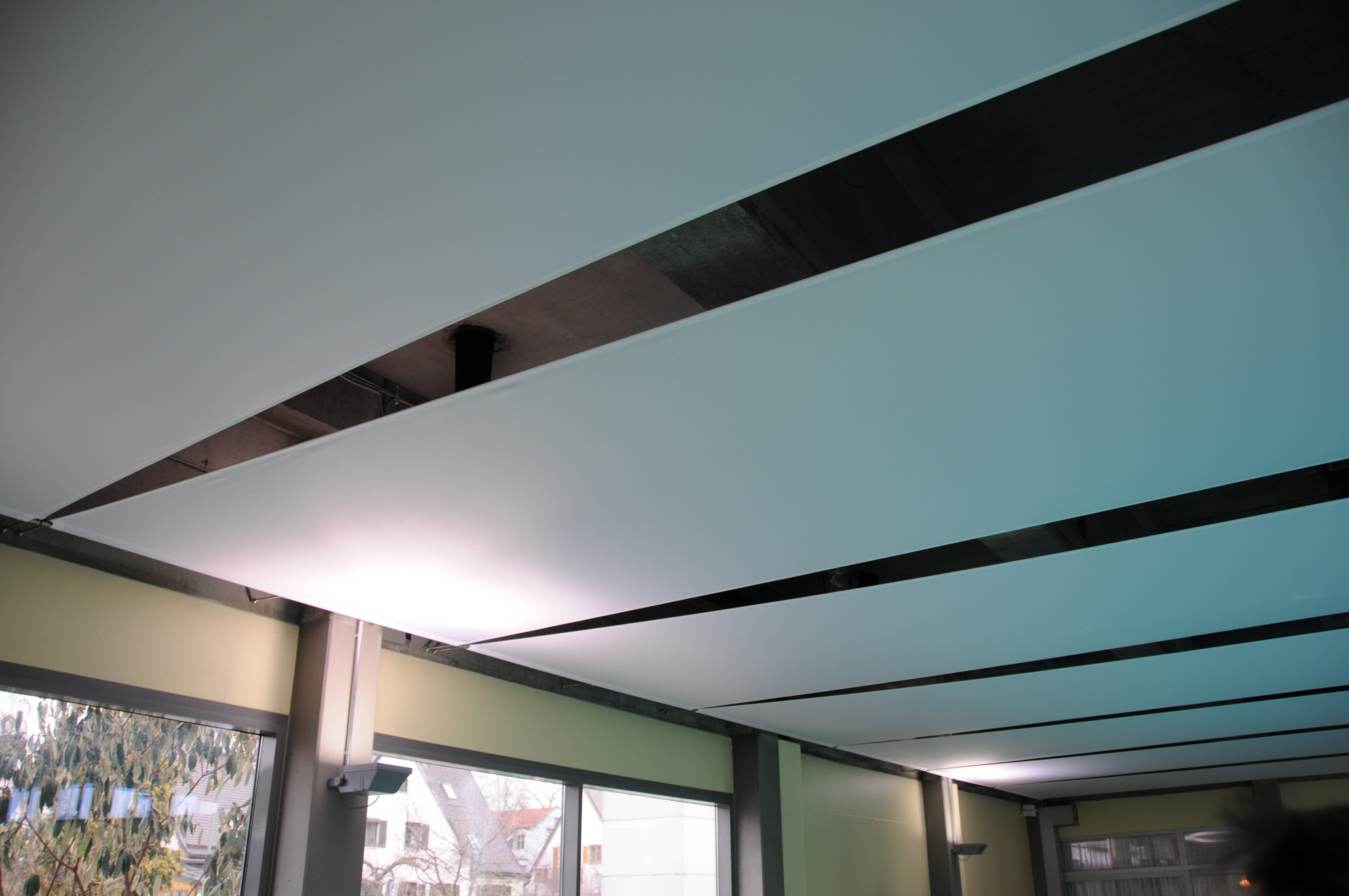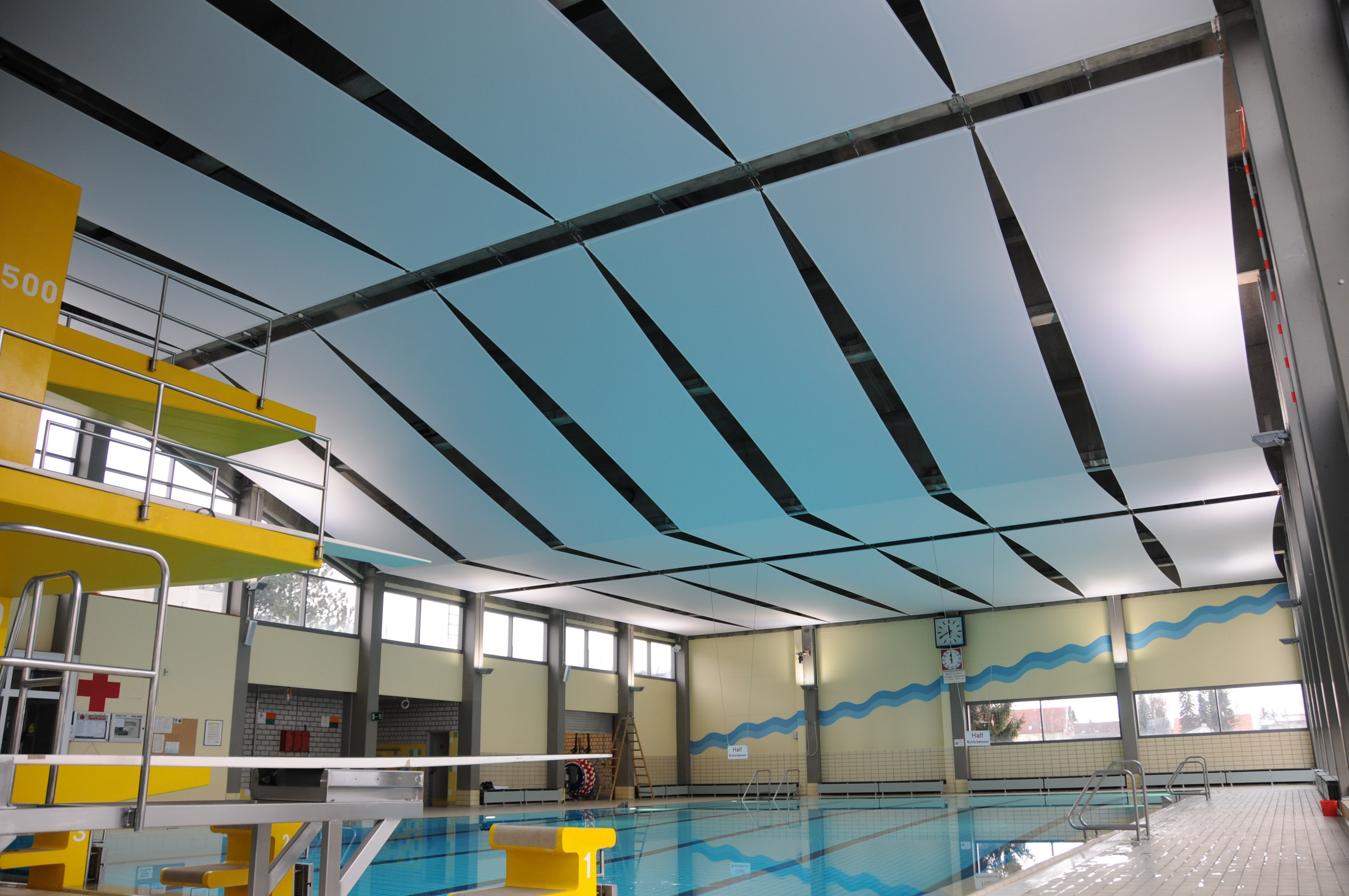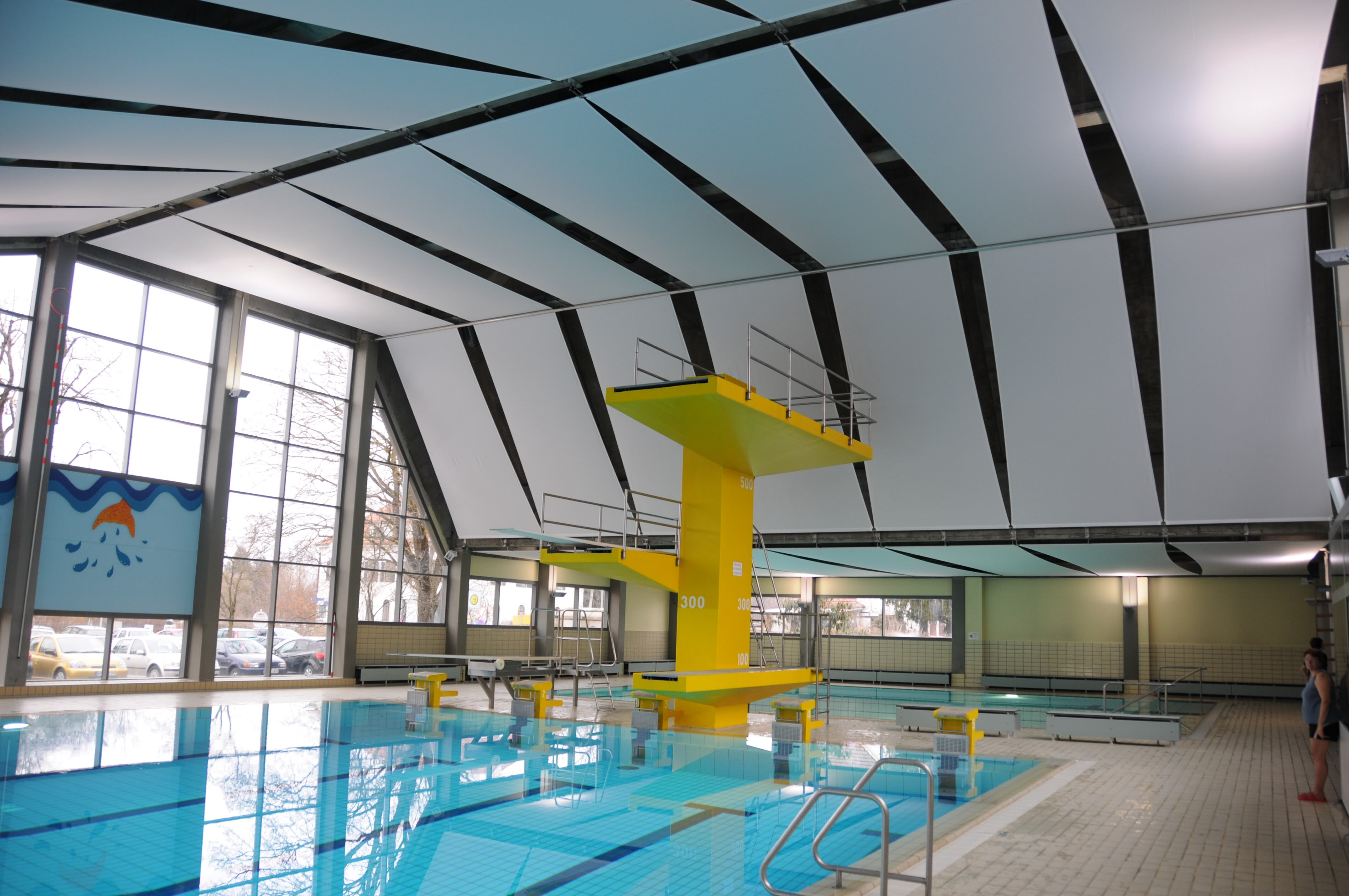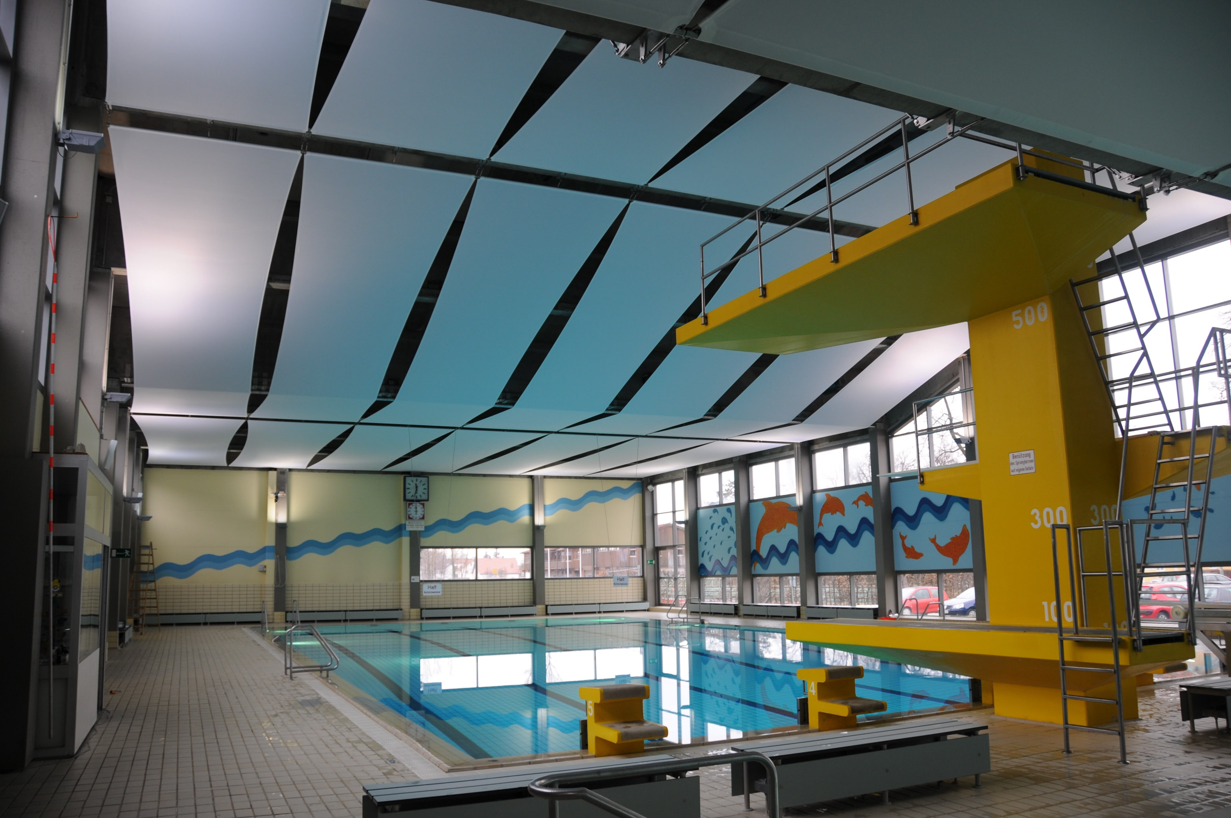 Die ursprünglich vorhandene Decke des Hallenbades in Weilheim wurde unter Verwendung des Spanndeckensystems RS ersetzt. Durch dieses System konnte die Nachhallzeit im Raum wesentlich reduziert werden. Darüber hinaus werden einige Segel über Umlenkrohre von der Horizontalen in schräge Flächen geführt. Dadurch wird die sägezahnförmige Dachkonstruktion auch im Innenraum abgebildet. Die Einzellängen der Akustiksegel betragen 11,20 m . Die Segelbreite liegt bei 2,85 m. Die gewählte Konstruktion stellt insgesamt eine kostengünstige und akustisch äußerst effektive Lösung dar.