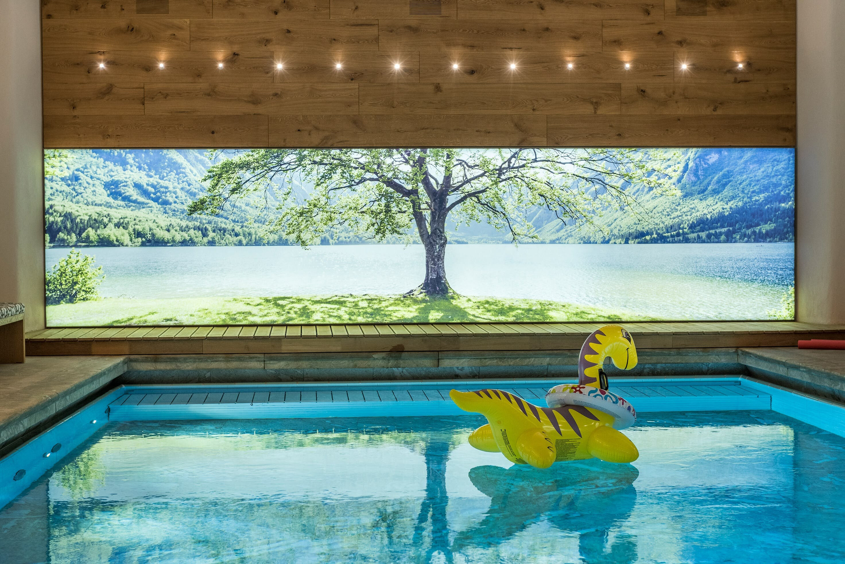Koch Membranen hat neben den Wandflächen an den Pools auch verschiedene Deckenflächen gestaltet. Das mit großformatigen Holzmotiven bedruckten Decken und die hinterleuchteten Wandbilder aus dem schallabsorbierenden Artex® Licht- und Akustikgewebe wirken täuschend echt und laden zum Verweilen ein.