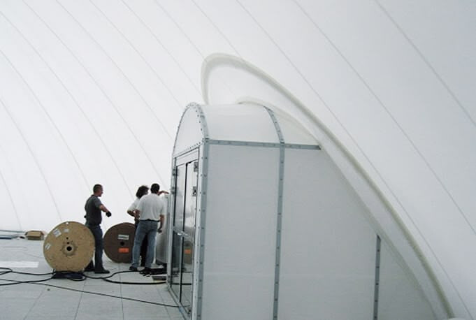 Mobile Immobilie: Pneumatisch gestützte Kugel-Membrane mit Wasser-Fundament und integrierter Luftschleuse.