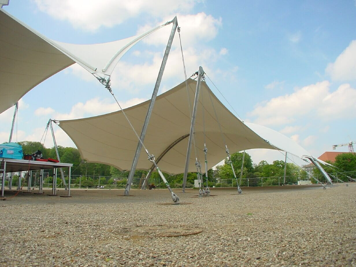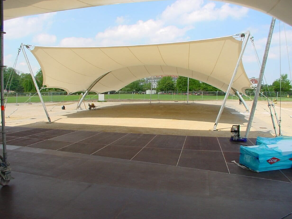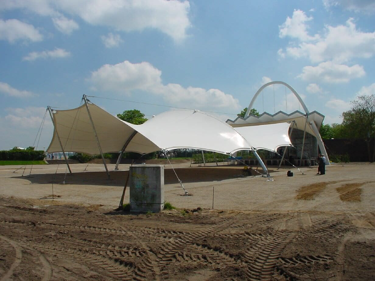 In Lübeck-Travemünde wurde das Bühnendach des Musikpavillons Brückmanngarten erweitert. Darüber hinaus wurden auch sämtliche Zuschauerplätze überdacht. Bei dieser Lösung wurden verschiedene Konstruktionsprinzipien miteinander vereint, wie zum Beispiel die Abspannung der Membrane direkt zum Bodenfundament sowie über Stützen zum Boden und ein großer Membranbereich, der ganz zuverlässig von einem Bogenbinder unterstützt wird.