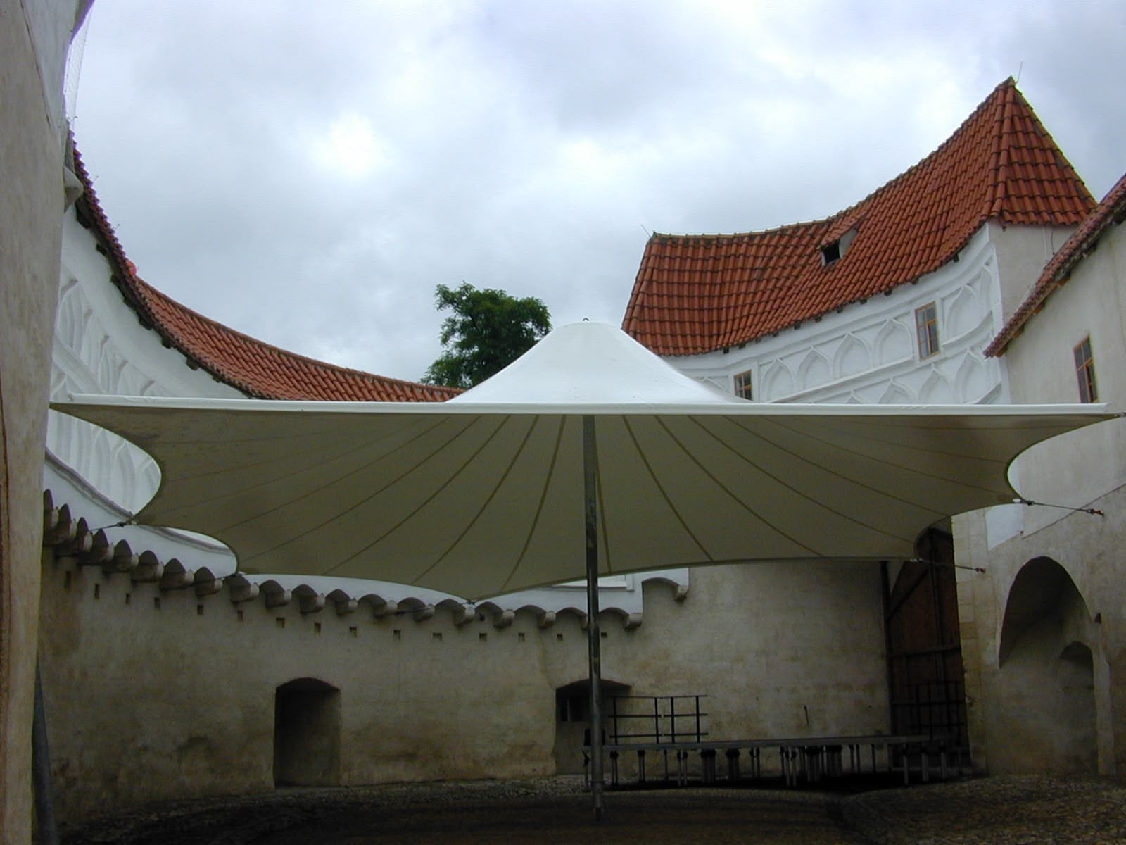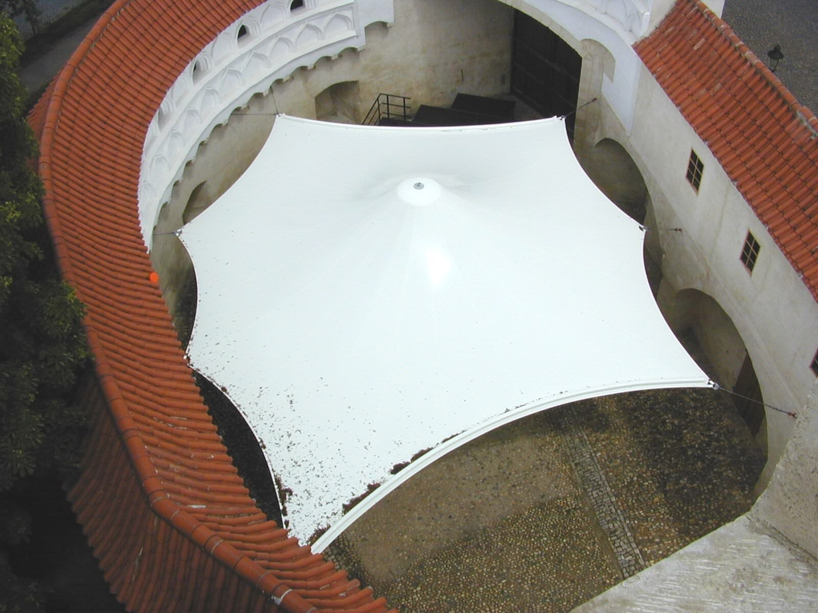 Der Innenhof des Renaissanceschlosses Weitra in Niederösterreich dient als Veranstaltungsort mit einem besonderen Ambiente. Um eine wetterunabhängige Nutzung zu sichern wurden im Schlosshof (ca. 22 x 32 m) vier wandelbare Trichterschirme installiert. Die Membranen selbst sind extrem knick- und alterungsbeständig.