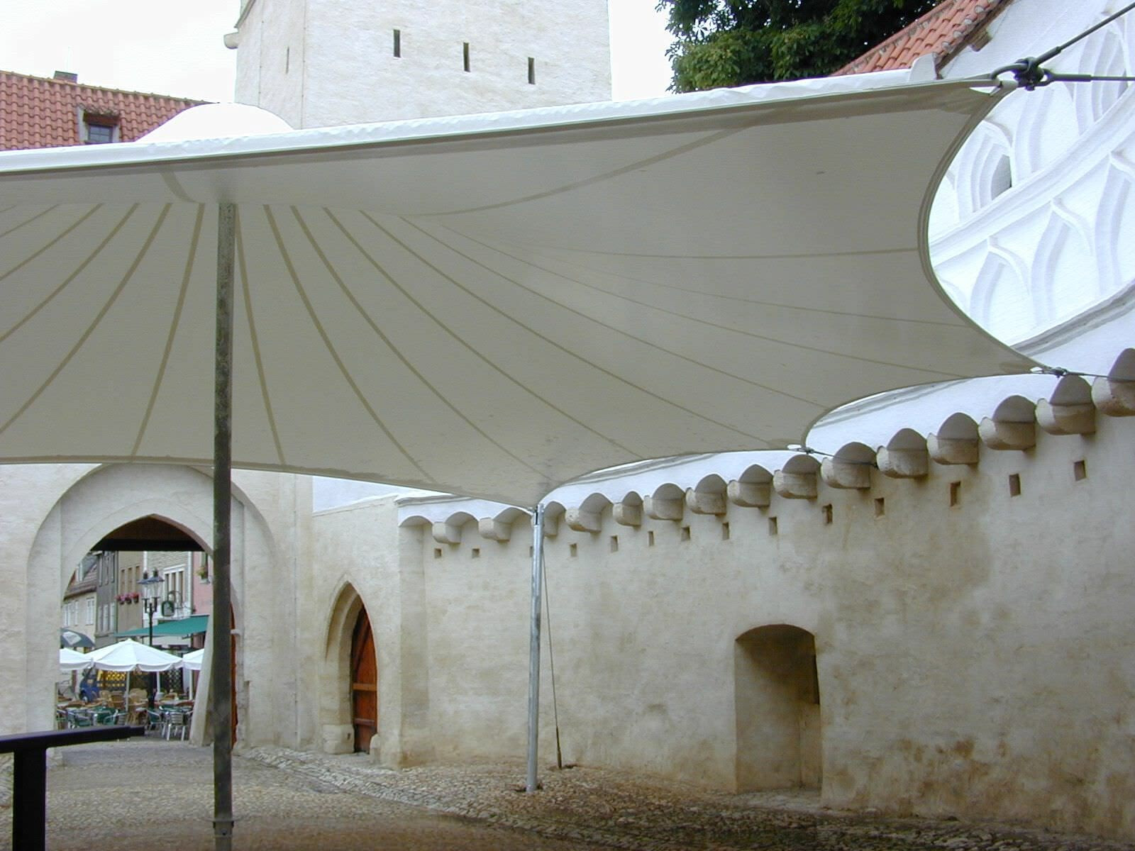 Die Überdachung der Stadttoranlage auf Schloß Naumburg (Marientor) wurde mittels einer Hochpunktmembrane mit zentralem Mast ausgeführt. Auf den Projektfotografien deutlich erkennbar ist die gelungene Symbiose von altem Gebäudebestand und moderner Membrankonstruktion.