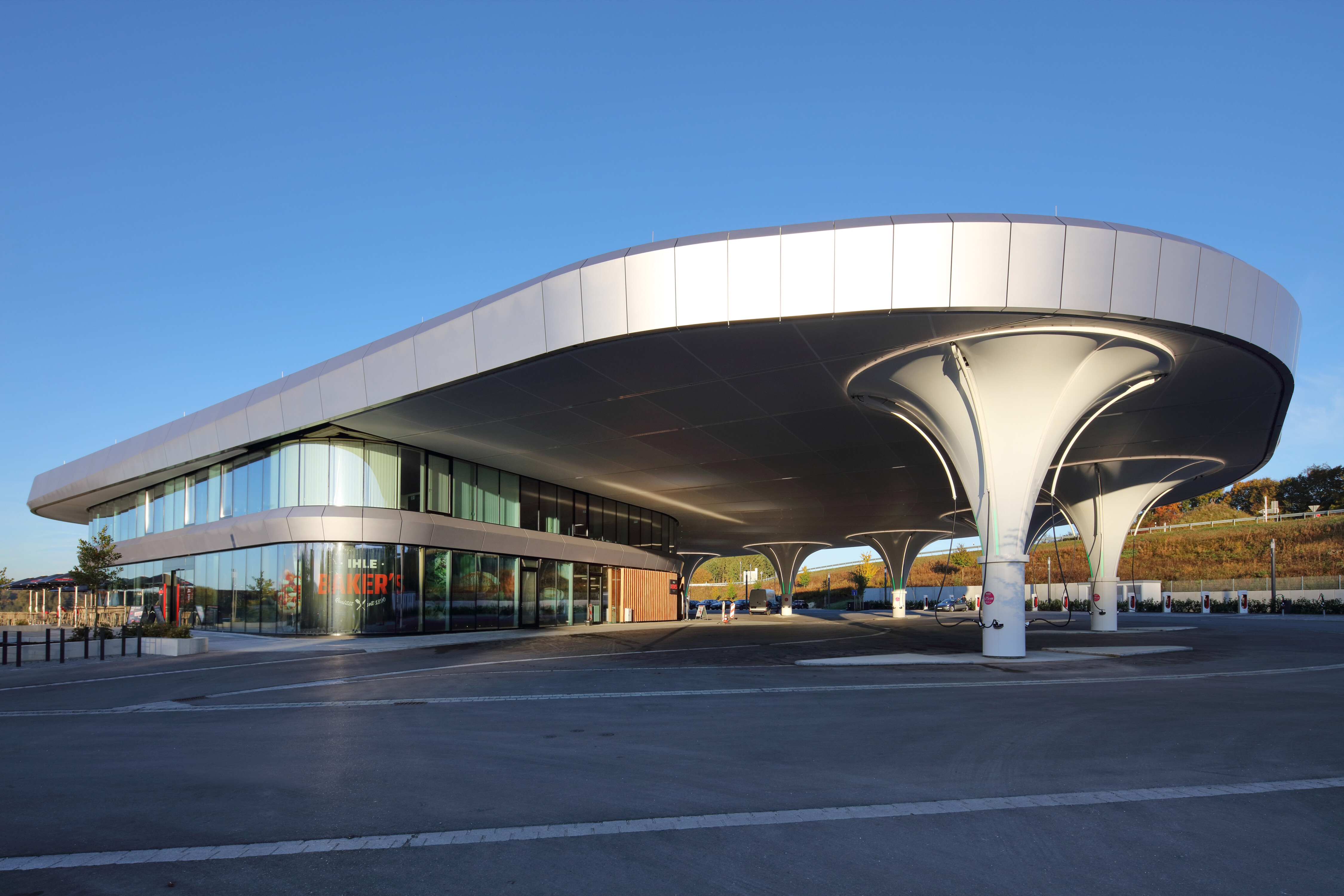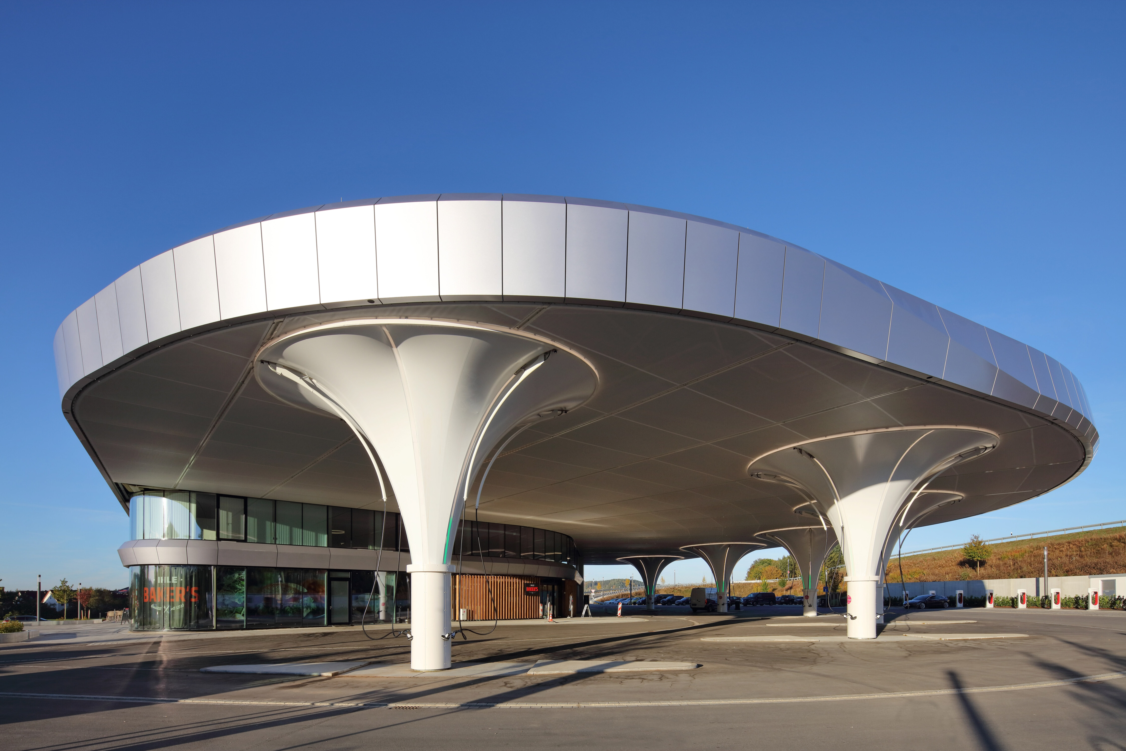 Zukunft der Mobilität: 1.600 m² Membranüberdachung für Europas größten E-Automobile-Schnelladestandort.