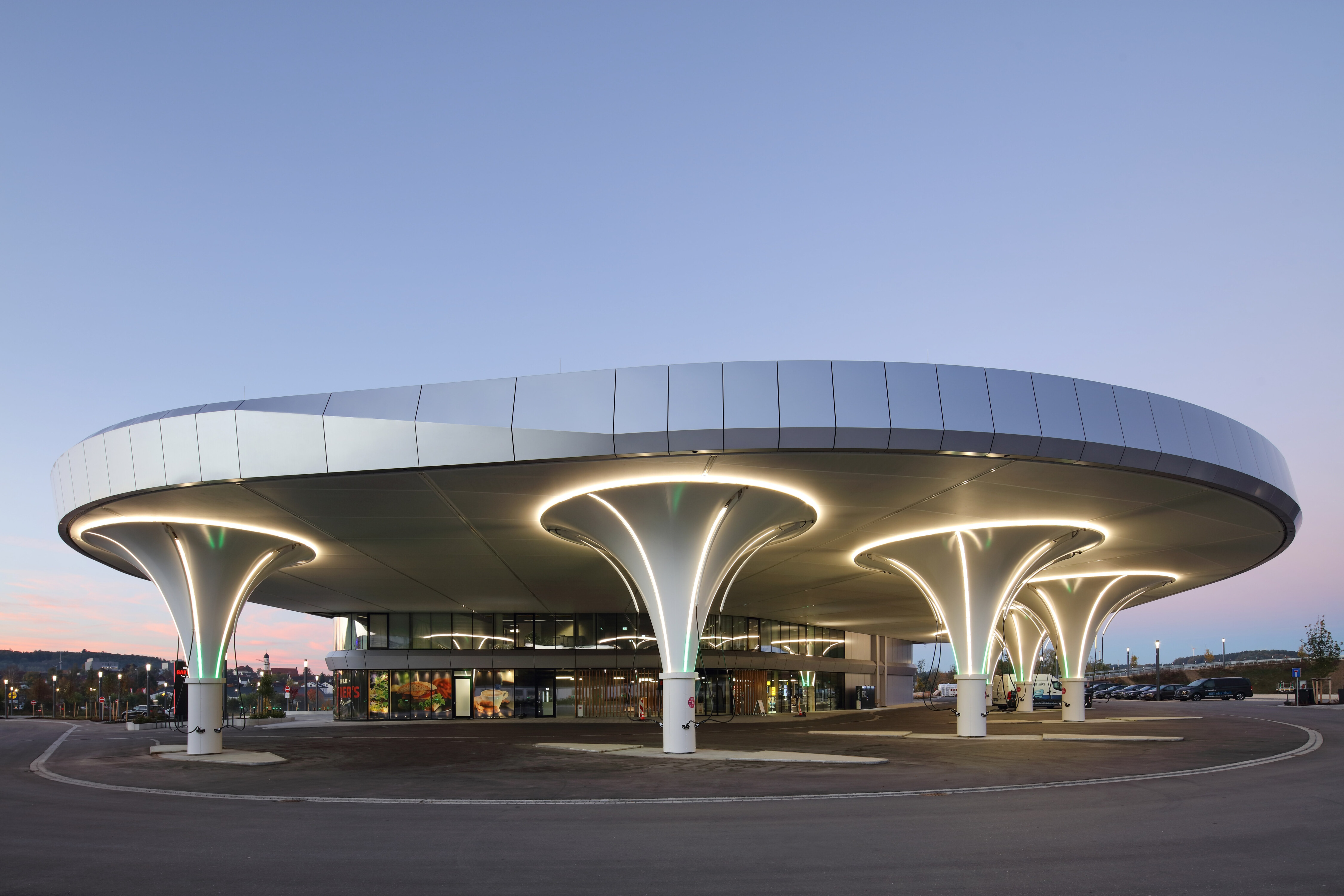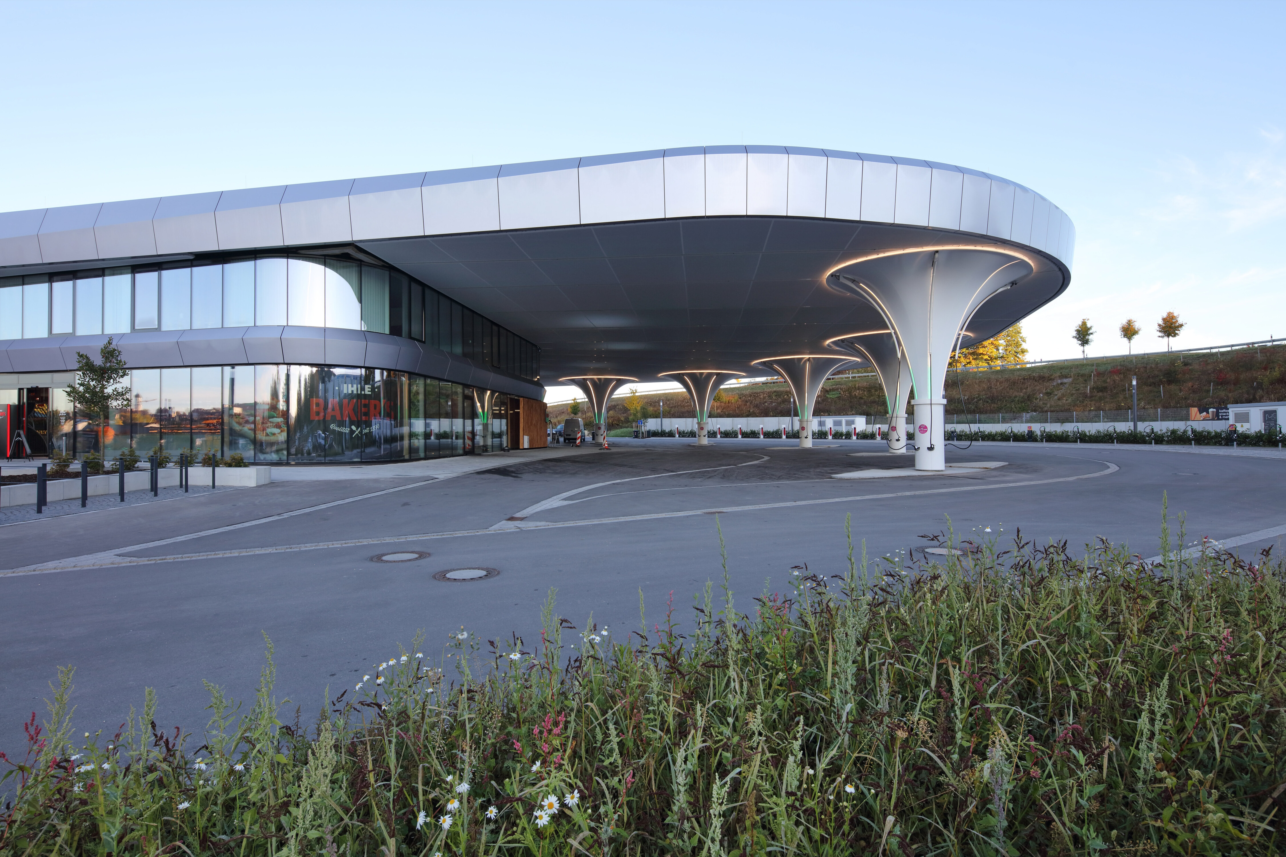 Die sechs pilzartigen Konstruktionen und die gesamte Unterdecke der Tankstelle wurden durch Koch Membranen installiert. Der Leistungsumfang erstreckte sich dabei von der Planung, über die Herstellung der Unterkonstruktion bis zur Installation der Membrane - alles aus einer Hand. Die sechs trichterförmigen Gebilde der Schnellladestationen wurden mit einem hochfesten und schwer entflammbaren Artex-Polyestergewebe bespannt. Jeweils ein Feld dieser Ladepilze ist innerhalb der Pilze aufklappbar, damit sich ein unkomplizierter Zugang für Wartungsarbeiten an der außergewöhnlichen Technik verschafft werden kann.
