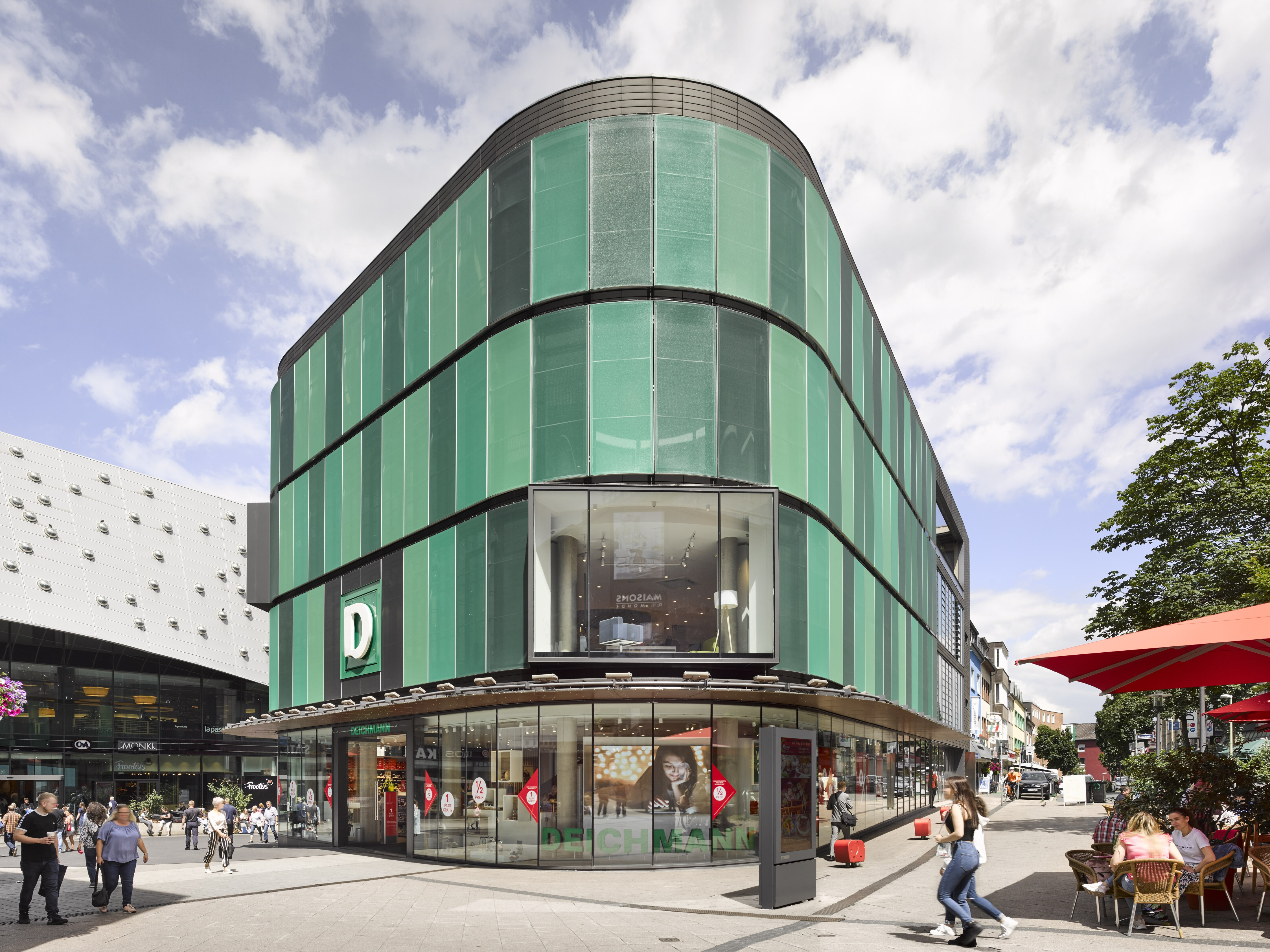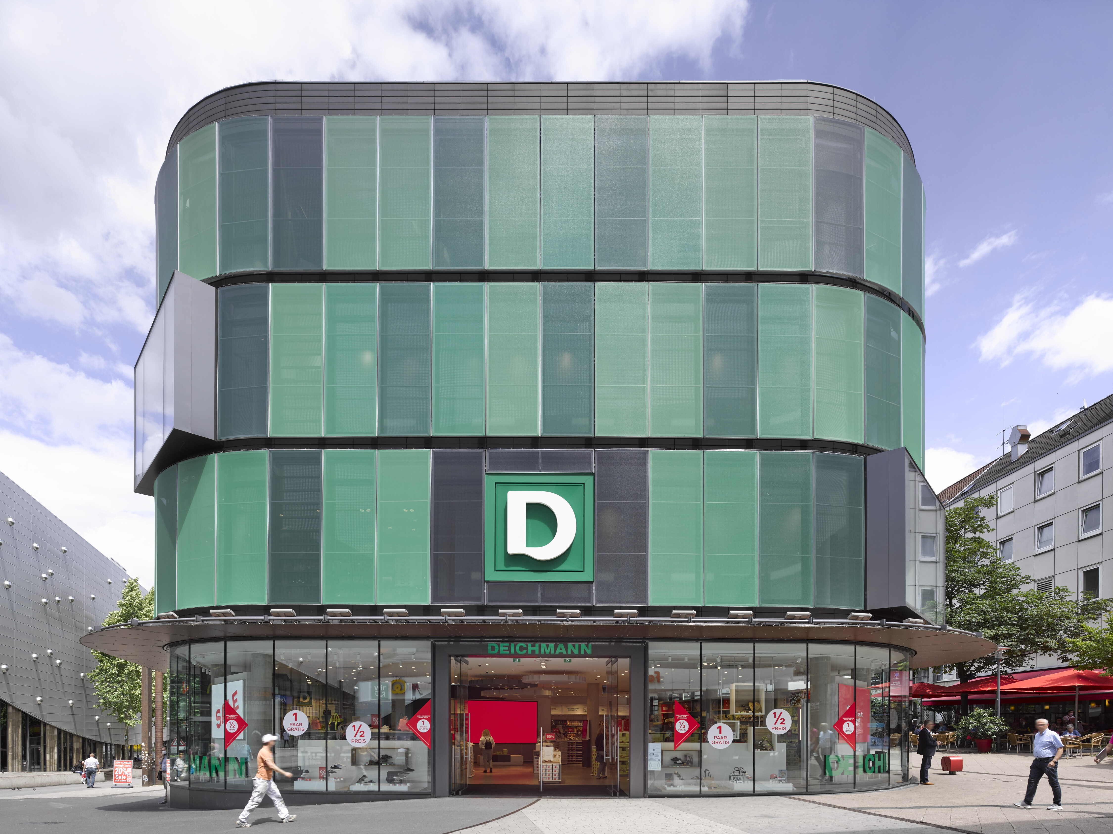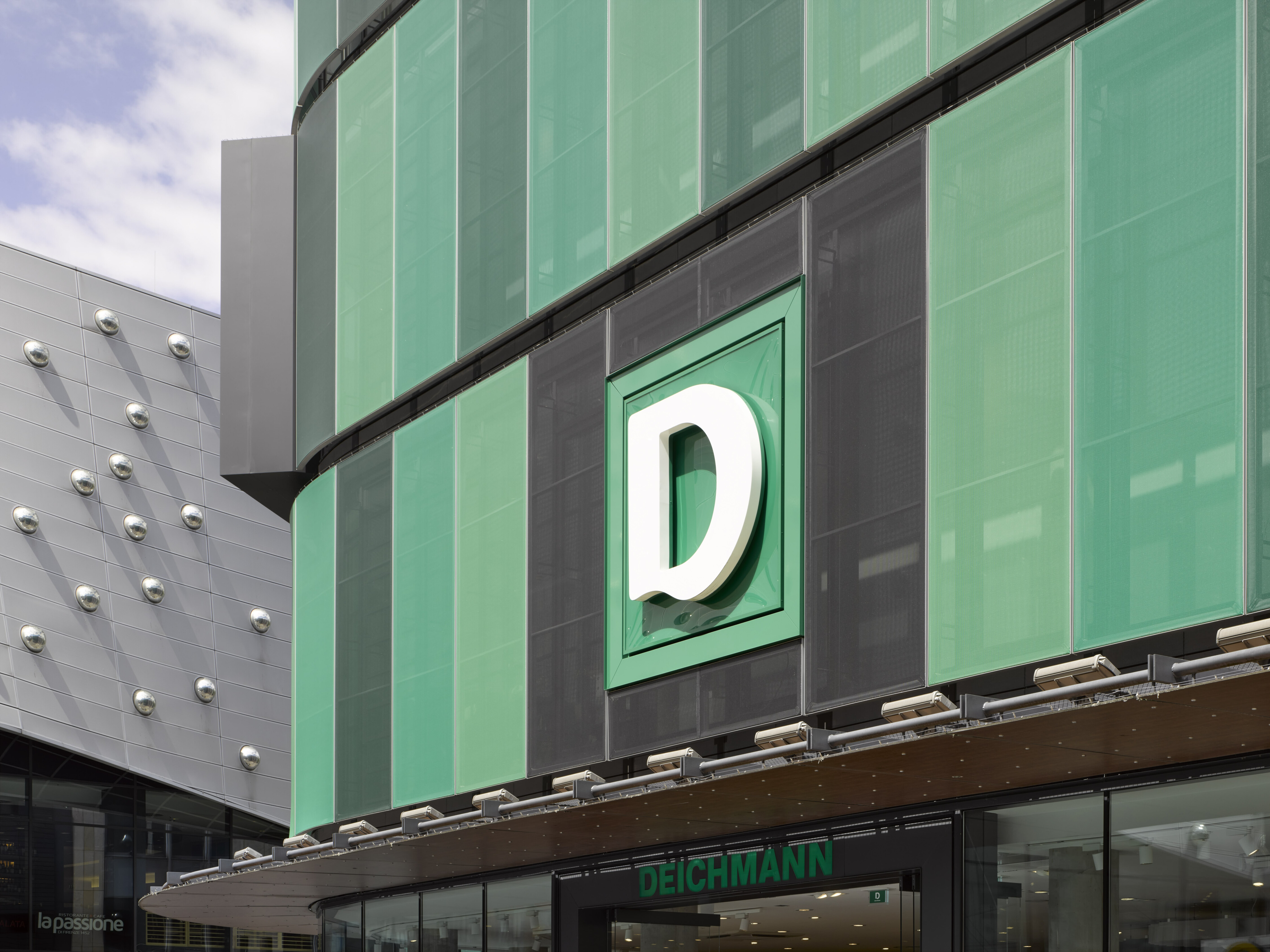 Die Filiale des Deichmann Flagshipstores am Limbecker Platz in Essen erhielt im Rahmen umfangreicher baulicher Veränderungen und Umbauarbeiten eine Erneuerung der Textilen Fassade.