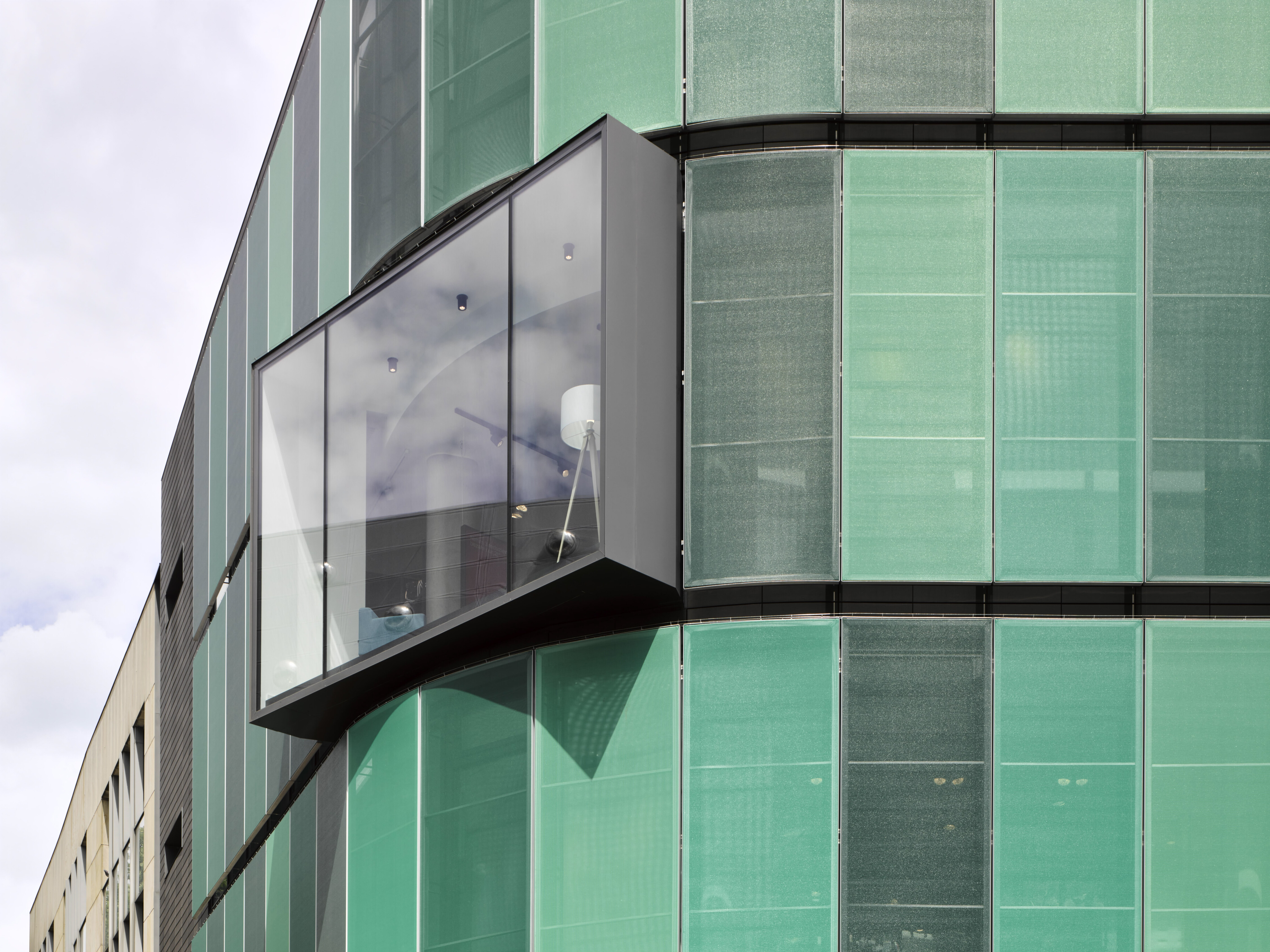 Dieser Baukörper mit seiner 7.000m² großen Fassade aus PTFE/Glas-Gittergewebe bietet Platz für 1600 Stellplätze. Dabei wirkt das neue Parkhaus nicht nur durch seine Größe beeindruckend: Durch die dreidimensionale Anordnung verschieden großer Dreiecke entsteht an der Fassade eine beeindruckende Oberflächengestaltung, die an Diamanten erinnern soll.