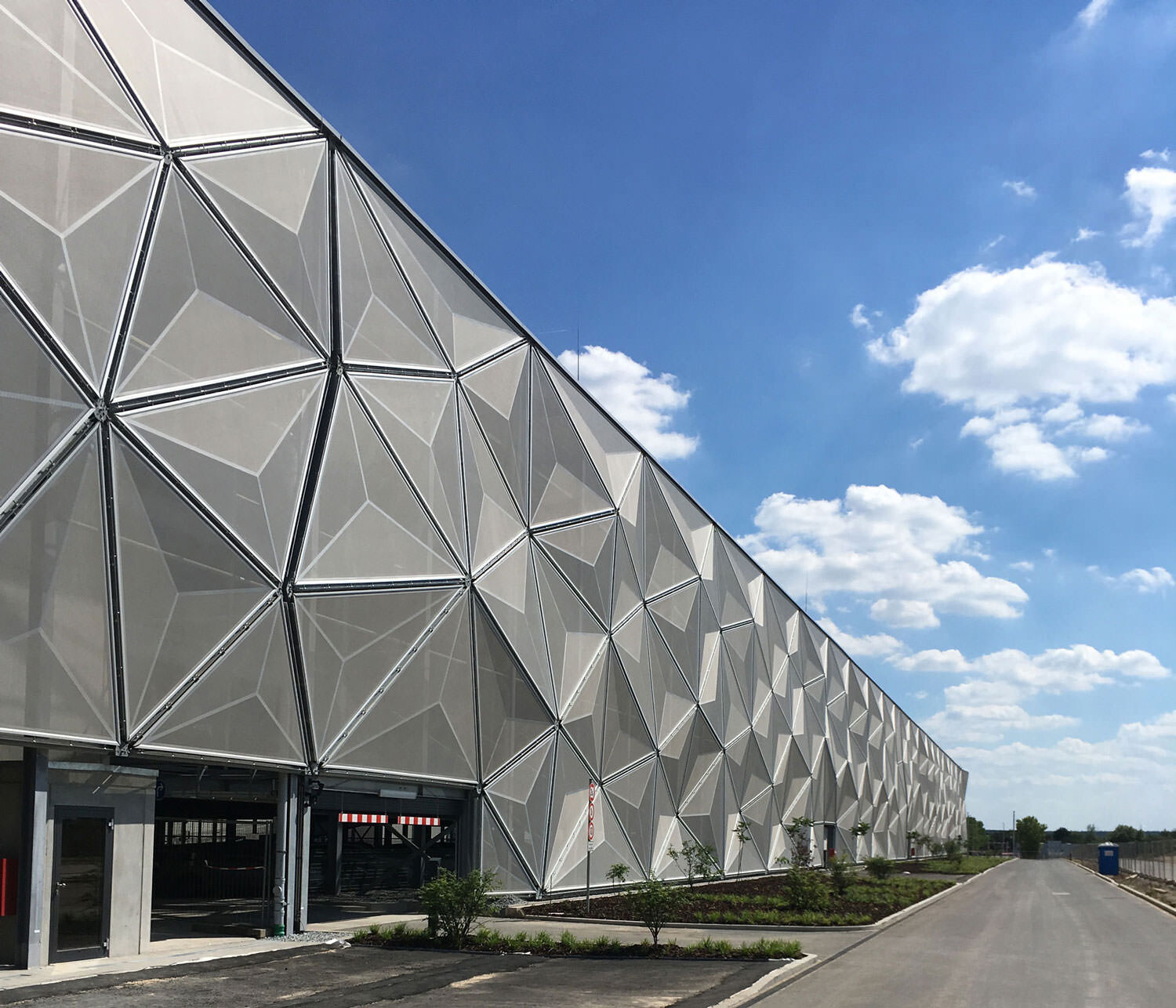 Dieser Baukörper mit seiner 7.000m² großen Fassade aus PTFE/Glas-Gittergewebe bietet Platz für 1600 Stellplätze. Dabei wirkt das neue Parkhaus nicht nur durch seine Größe beeindruckend: Durch die dreidimensionale Anordnung verschieden großer Dreiecke entsteht an der Fassade eine beeindruckende Oberflächengestaltung, die an Diamanten erinnern soll.