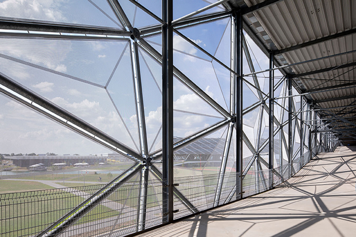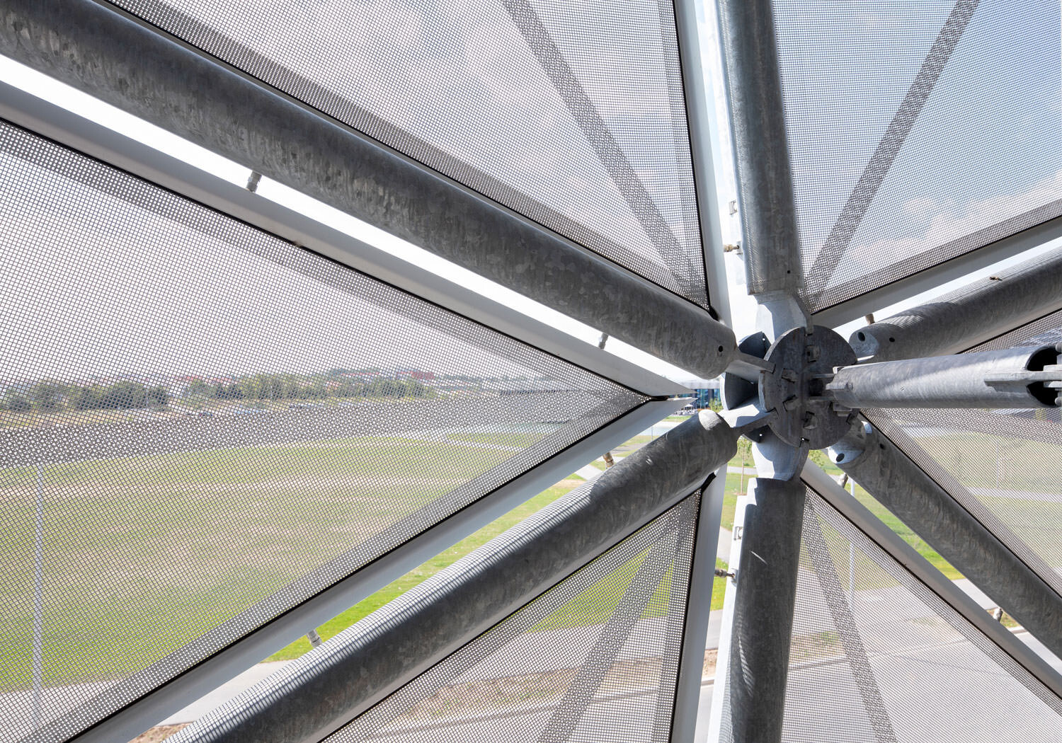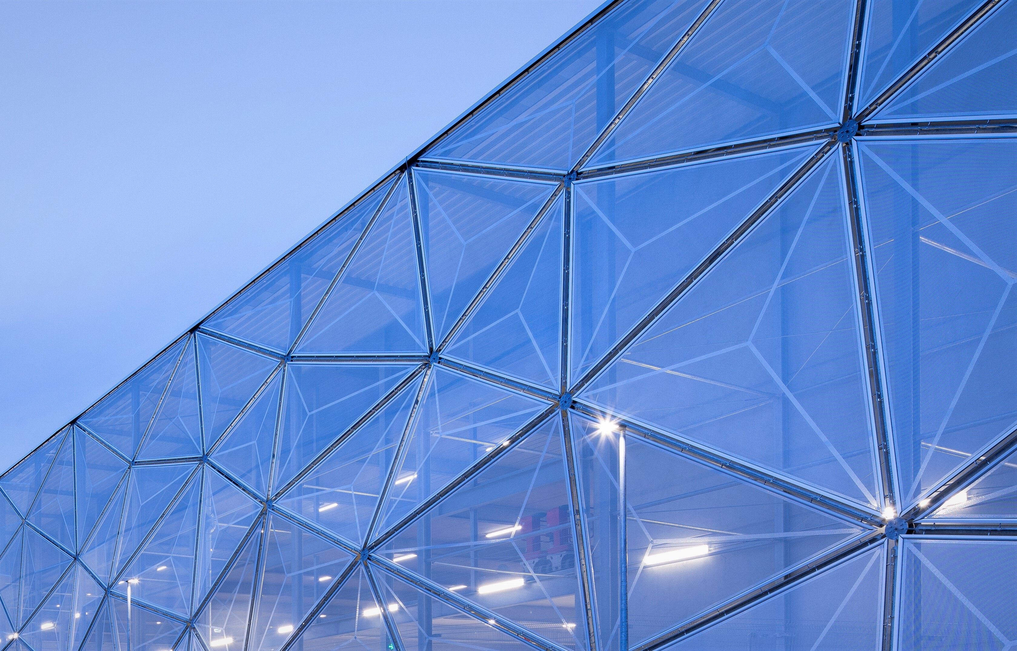 Für dieses Projekt wurden insgesamt 670 unterschiedliche Teile mit einer komplexen just-in-time Logistik montiert. Für die Textile Fassade kam ein speziell entwickeltes Spannsystem zum Einsatz. Die Membranen sind je Dreieck aus drei Zuschnitten zusammengefügt. Die Knotenpunkte variieren dabei in unterschiedlichen Abständen und erzeugen eine zusätzliche dreidimensionale Wirkung.