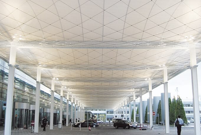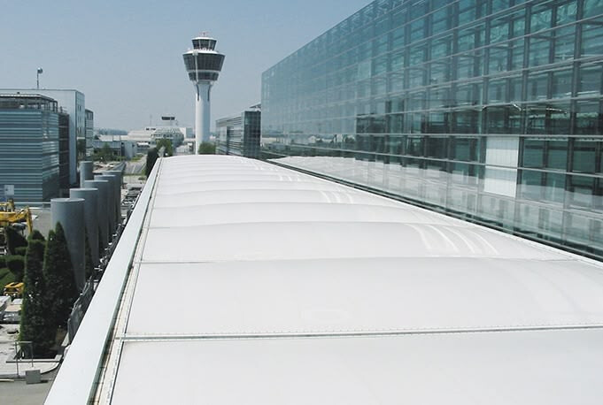 Das Vordach am Terminal 2 des Münchner Flughafens ist eine klassische pneumatische Konstruktion aus zweilagigen Luftkissen. Dabei werden die Luftkissen über rechteckige Stahlrahmen und einem Seilnetz gehalten.