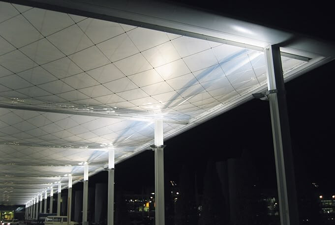 Die Überdachung des Busbahnhofes besteht aus einer Stahl-Membrankonstruktion und erstreckt sich bei einer Länge von 120 Metern und einer Breite von 24 Metern auf eine Gesamtfläche von über 2.000 m².