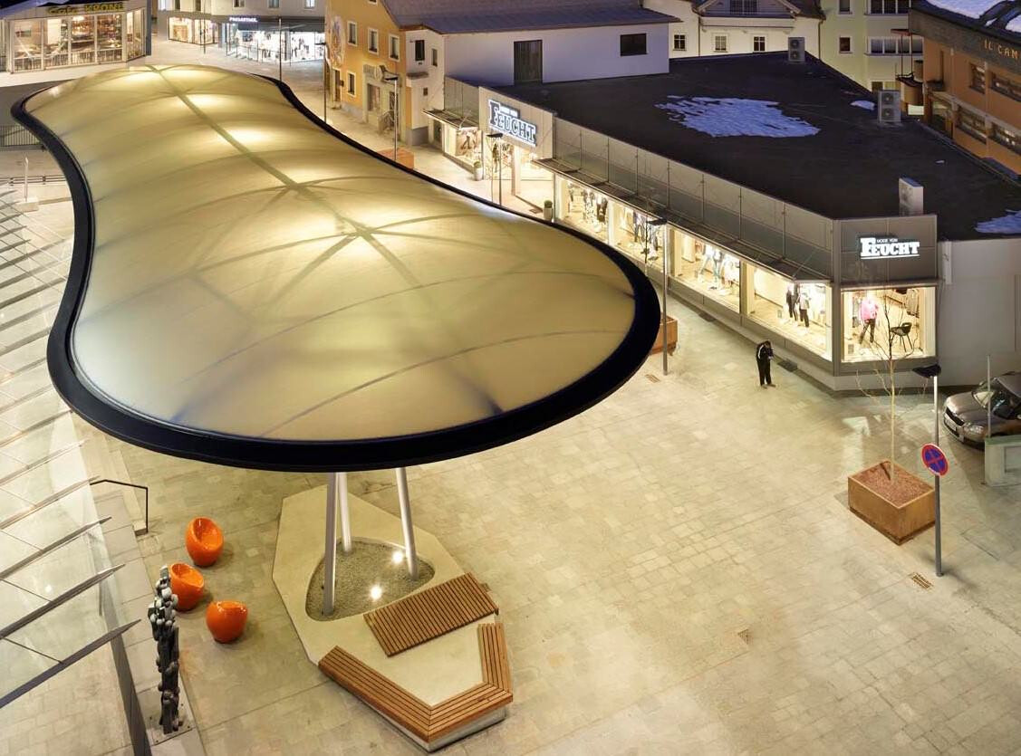 Stadtplatz-Herzstück: 35-Meter-Spannweite mit pneumatisch vorgespannter ETFE-Folie trotzt alpinen Schneelasten.