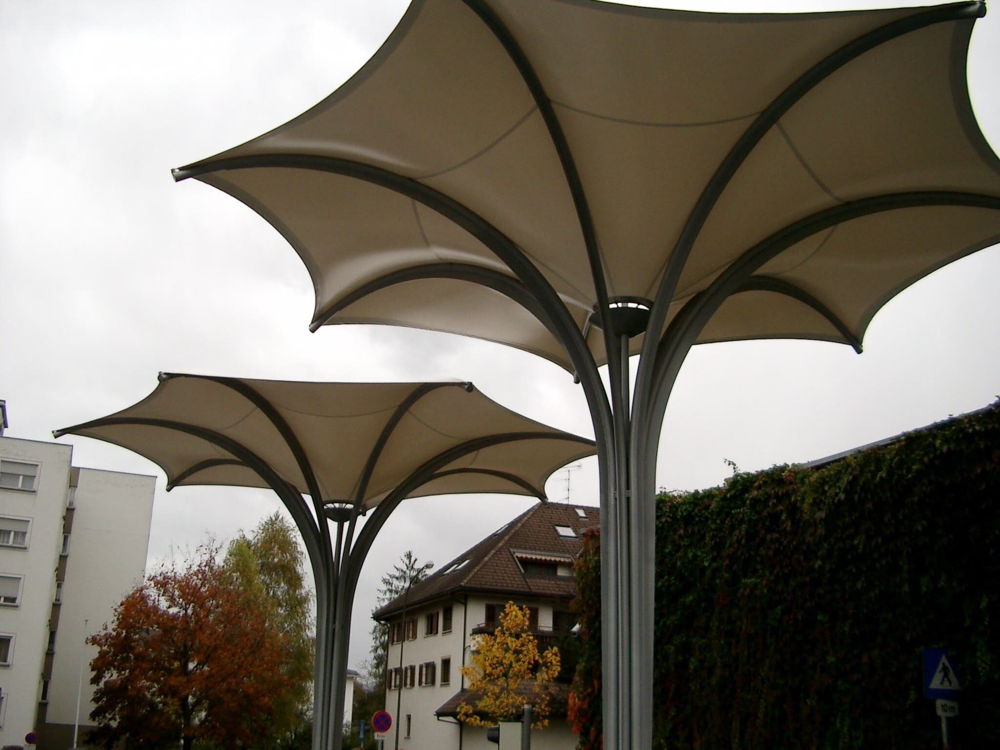 Die Zufahrtsüberdachung der Parkplatzeinfahrt für das Krankenhaus Hohenems in Österreich wurde mit zwei Trichterschirmen mit je einem Durchmesser von 7,20 m realisiert.