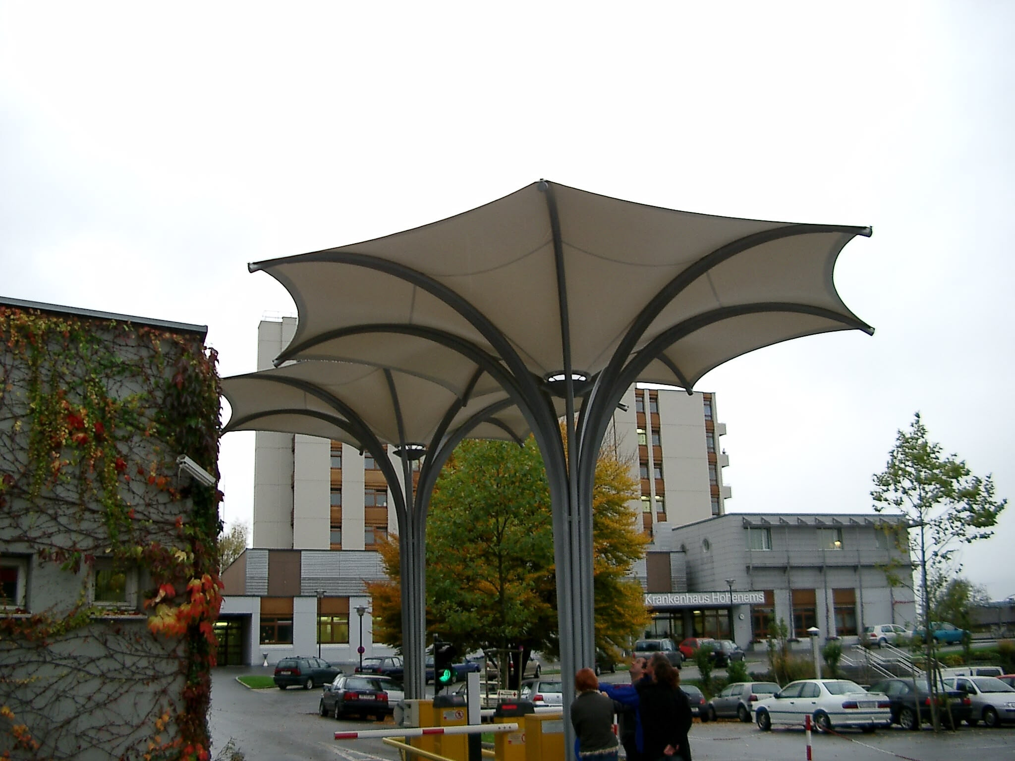 Krankenhaus-Zufahrt überdacht: Zwei Trichterschirme mit 7,20 m Durchmesser schützen Parkplatzeinfahrt.