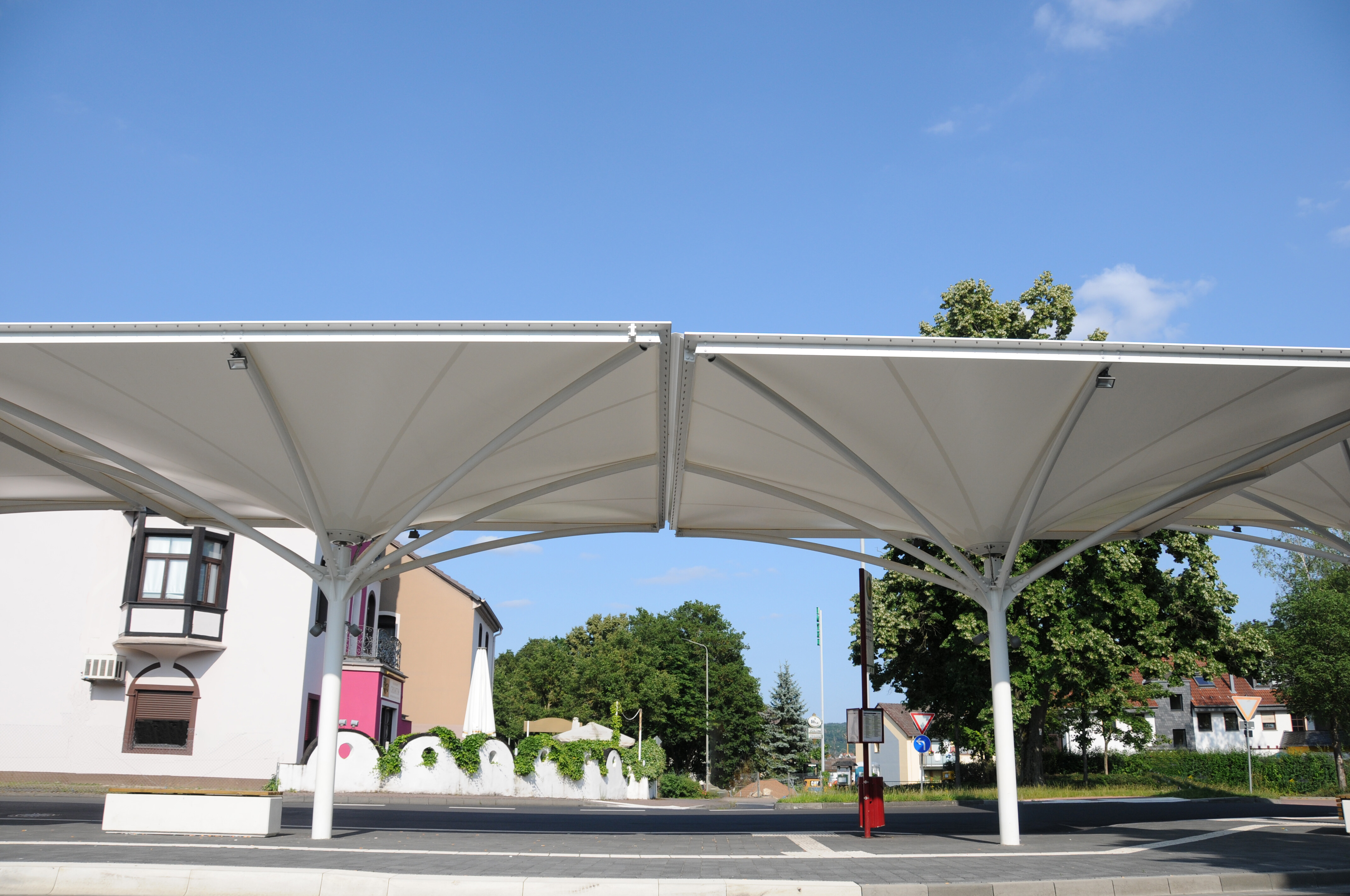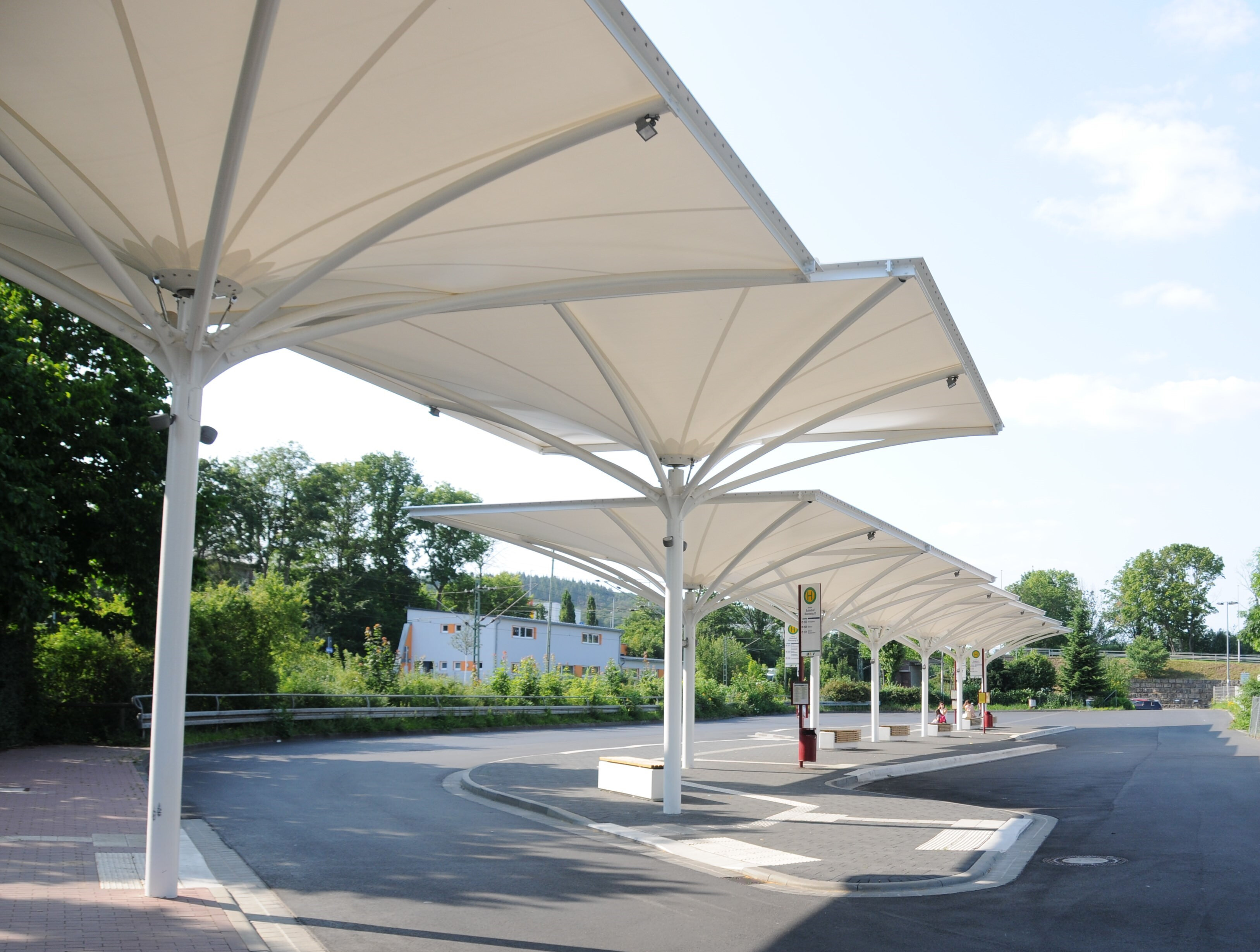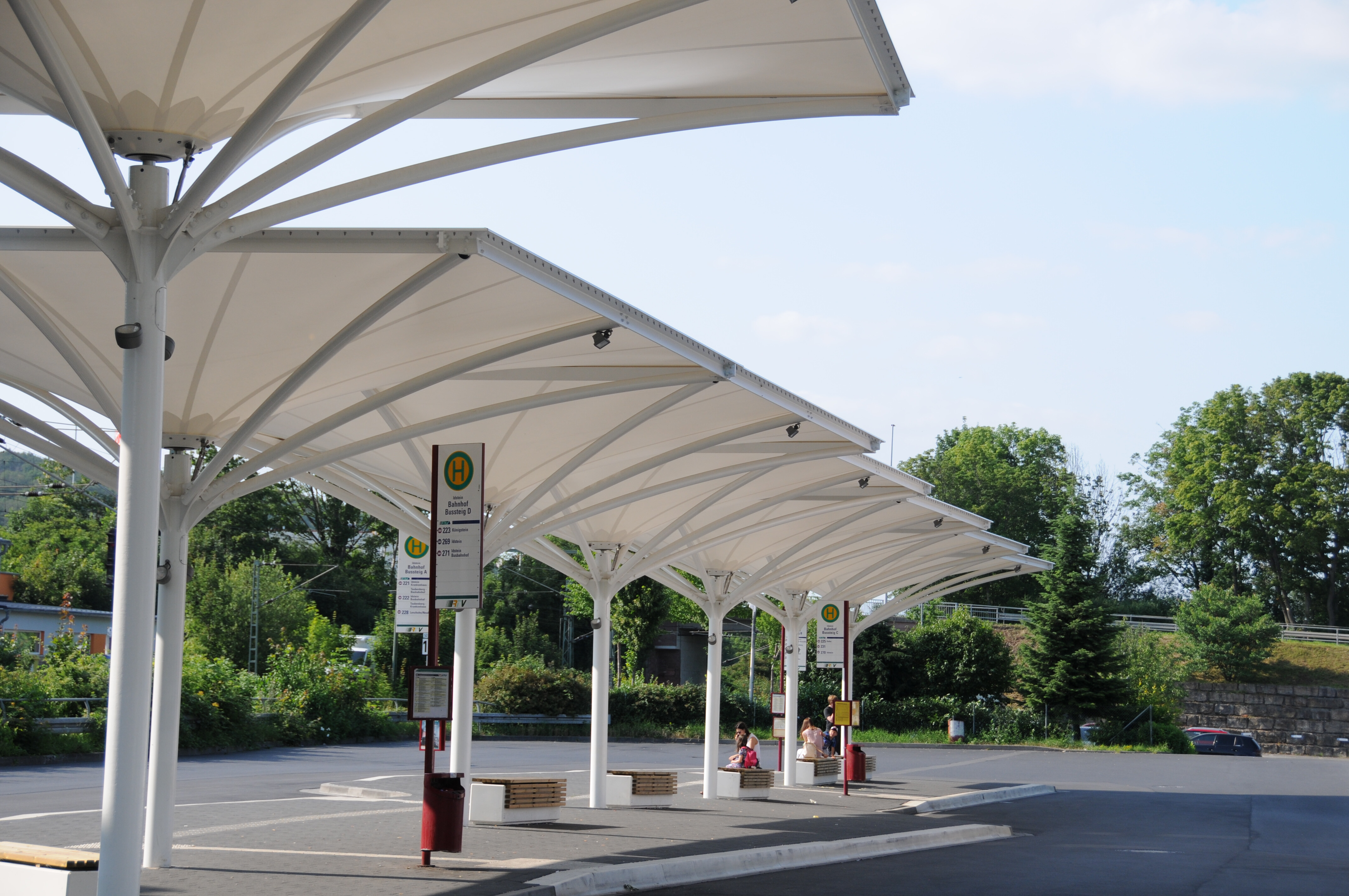 Die Überdachung des Busbahnhofes besteht aus einer Stahl-Membrankonstruktion und erstreckt sich bei einer Länge von 120 Metern und einer Breite von 24 Metern auf eine Gesamtfläche von über 2.000 m².